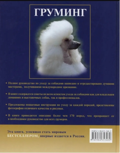 Перед вами полное руководство по уходу за собаками, написанное и отредактированное лучшими мастерами международного класса. Груминг – система мер, направленных на то, чтобы сохранить кожу и шерсть здоровыми, чистыми и в хорошем состоянии. Сюда также входит уход за зубами, ушами и когтями собаки. Груминг - неотъемлемая часть ухода за собакой. Он помогает не только содержать животных чистыми и хорошо ухоженными, но также укрепляет отношения между владельцем и животным. В книге содержатся советы по всем аспектам ухода за собаками, как для владельцев домашних и выставочных собак, так и профессионалов, пошаговые инструкции по уходу за каждой породой, фотографии отличного качества и рисунки. Описание более чем 170 пород превращает настоящую книгу в необходимое руководство для всех грумеров.