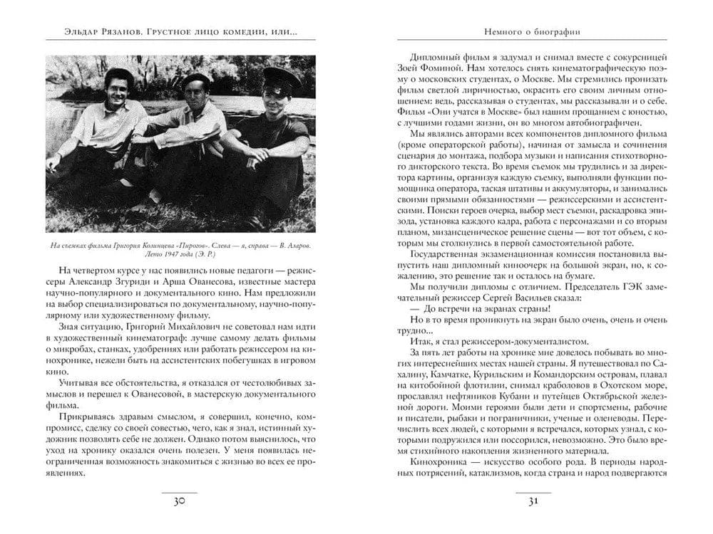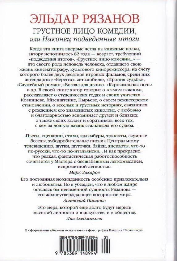 Когда эта книга впервые легла на книжные полки, автору исполнилось 82 года — возраст, требующий «подведения итогов». «Грустное лицо комедии, или...» — это своего рода исповедь человека, отдавшего свою жизнь кинематографу, культового кинорежиссера, на счету которого более двух десятков игровых фильмов, среди них легендарные «Берегись автомобиля», «Ирония судьбы», «Служебный роман», «Вокзал для двоих», «Карнавальная ночь» и др. По признанию автора, он всю жизнь «трудился как лошадь». Кроме фильмов, Эльдар Рязанов создал более двухсот авторских телепередач, писал пьесы, повести, сценарии и стихи, был педагогом и продюсером… В своей книге автор говорит о «самом важном», рассказывает о студенческих годах и своих учителях — Козинцеве, Эйзенштейне, Пырьеве, о своем режиссерском становлении, о веселых и грустных историях, связанных с рождением его знаменитых кинолент, с любовью и благодарностью вспоминает друзей и близких, а также артистов, художников, композиторов, операторов, монтажеров — своих коллег и соратников, всех тех, с кем за долгую жизнь сталкивала его судьба.