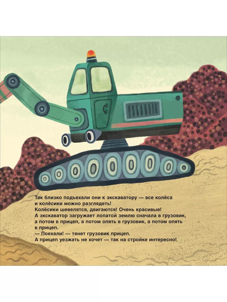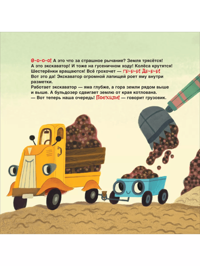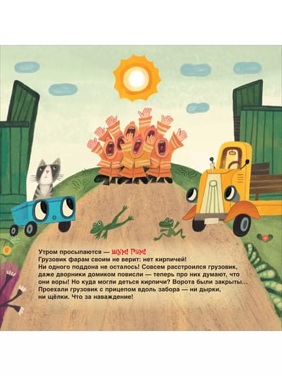 Куда же неразлучные друзья отправятся на этот раз? Конечно, на стройку! А там… Шум, гам, суета: бульдозер рычит, экскаватор грохочет, бетономешалка гудит, строители в касках туда-сюда бегают — все строят дом! Вот только кирпичи куда-то пропали… Грузовик и прицеп, скорее на поиски!