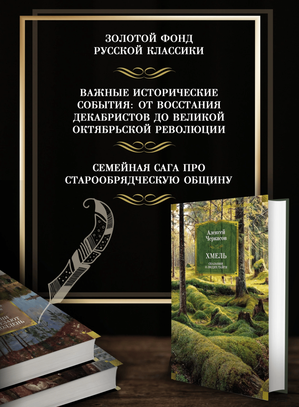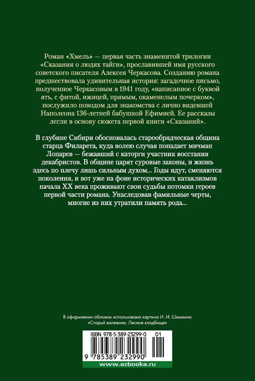 Роман «Хмель» - первая часть знаменитой трилогии «Сказания о людях тайги», прославившей имя русского советского писателя Алексея Черкасова. Созданию романа предшествовала удивительная история: загадочное письмо, полученное Черкасовым в 1941 г., «написанное с буквой ять, с фитой, ижицей, прямым, окаменелым почерком», послужило поводом для знакомства с лично видевшей Наполеона 136-летней бабушкой Ефимией, рассказы которой легли в основу сюжета первой книги «Сказаний».
