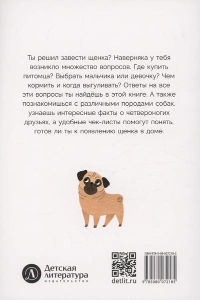 Ты решил завести щенка? Наверняка у тебя возникло множество вопросов. Где купить питомца? Выбрать мальчика или девочку? Чем кормить и когда выгуливать? Ответы на все эти вопросы ты найдёшь в этой книге. А также познакомишься с различными породами собак, узнаешь интересные факты о четвероногих друзьях, а удобные чек-листы помогут понять, готов ли ты к появлению щенка в доме.