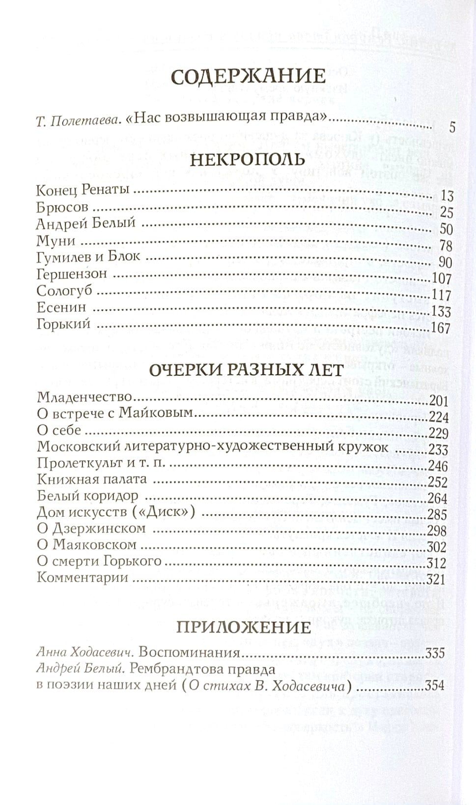 В книгу вошли сборник «Некрополь», составленный автором в 1939 году, очерки разных лет, печатавшиеся в российских и зарубежных изданиях, а также воспоминания его жены Анны Ходасевич и статья Андрея Белого о поэзии Ходасевича.