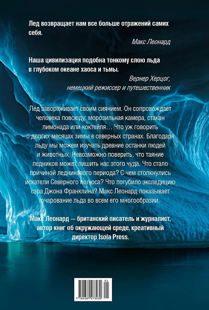 «Лед был одним из важнейших мостов, соединяющих нас с миром природы… Он влиял на развитие человека еще в глубокой древности, сопровождал земледельцев и кочевников доисторической эпохи… Безо льда мы не смогли бы прокормить себя и лечить больных, как мы это сейчас делаем. Наука не развивалась бы по тем направлениям, по которым она развивается. Безо льда наши города, деревни, моря и океаны выглядели бы совершенно иначе, а многие шедевры, украшающие галереи и библиотеки, попросту не существовали бы» (Макс Леонард).