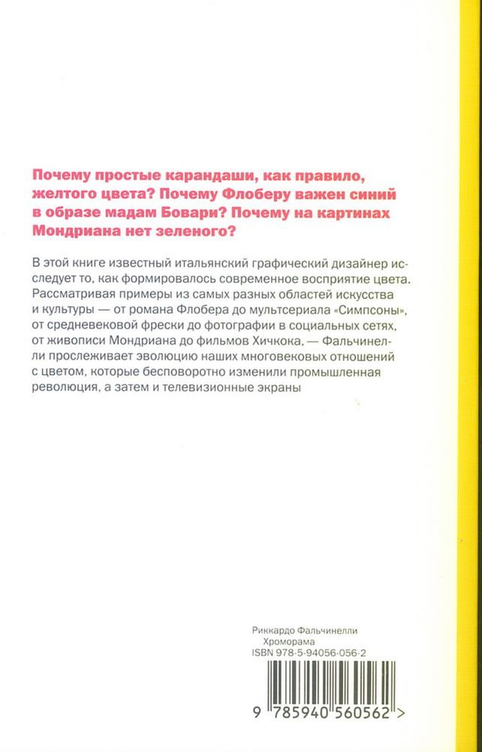 В этой книге известный итальянский графический дизайнер исследует то, как формировалось современное восприятие цвета. Рассматривая примеры из самых разных областей искусства и культуры — от романа Флобера до мультсериала «Симпсоны», от средневековой фрески до фотографии в социальных сетях, от живописи Мондриана до фильмов Хичкока, — Фальчинелли прослеживает эволюцию наших многовековых отношений с цветом, которые бесповоротно изменили промышленная революция, а затем и телевизионные экраны.