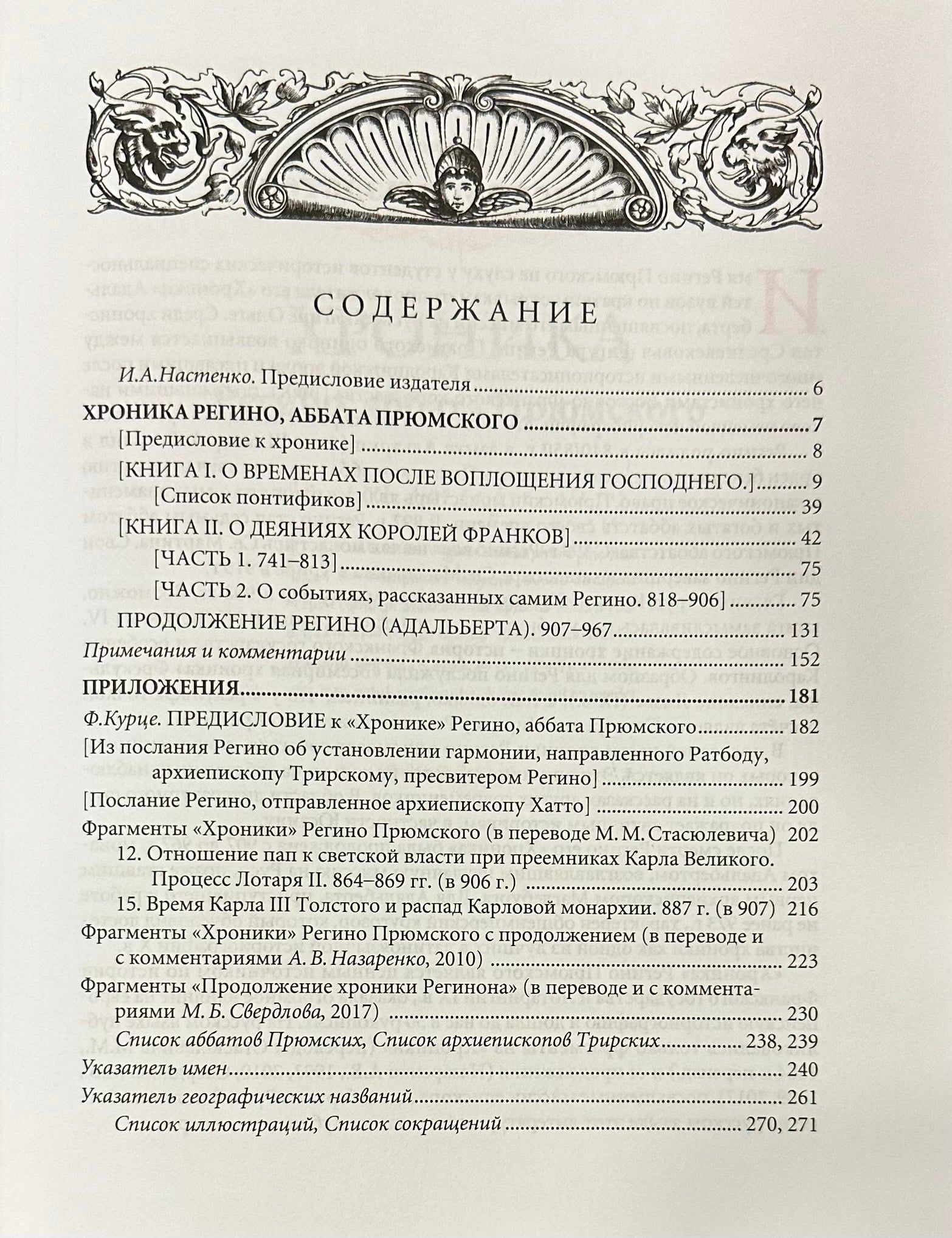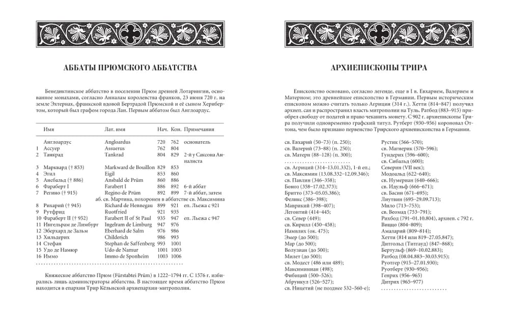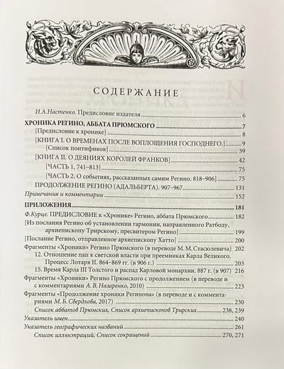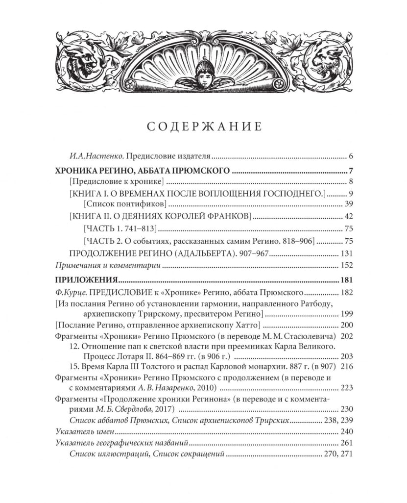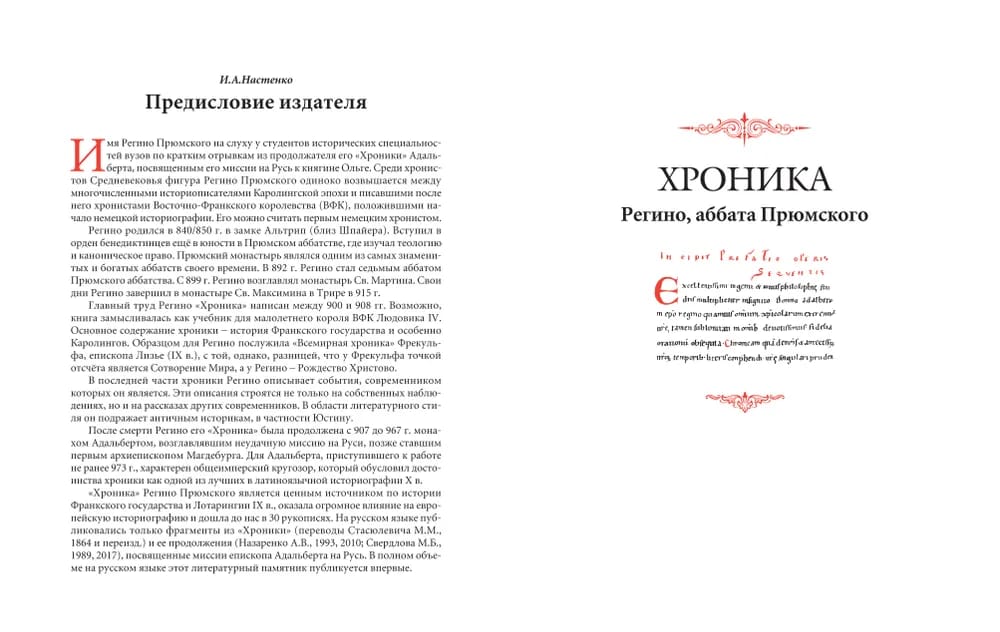 Регино (840/850–915), аббат Прюмский, историк посткаролингской эпохи, первый немецкий хронист. Его «Хроника» явлется всемирной хроникой (от Рождества Христова и доведенная продолжателем до 967 г.), по сведениям IX–X вв. — ценнейший исторический источник. Продолжение хроники написано Адальбертом, миссийным епископом, посланным на Русь к княгине Ольге. Миссия оказалась неудачной, а Адальберт стал архиепископом Магдебургским. Книга снабжена научным аппаратом, приложениями и указателями.