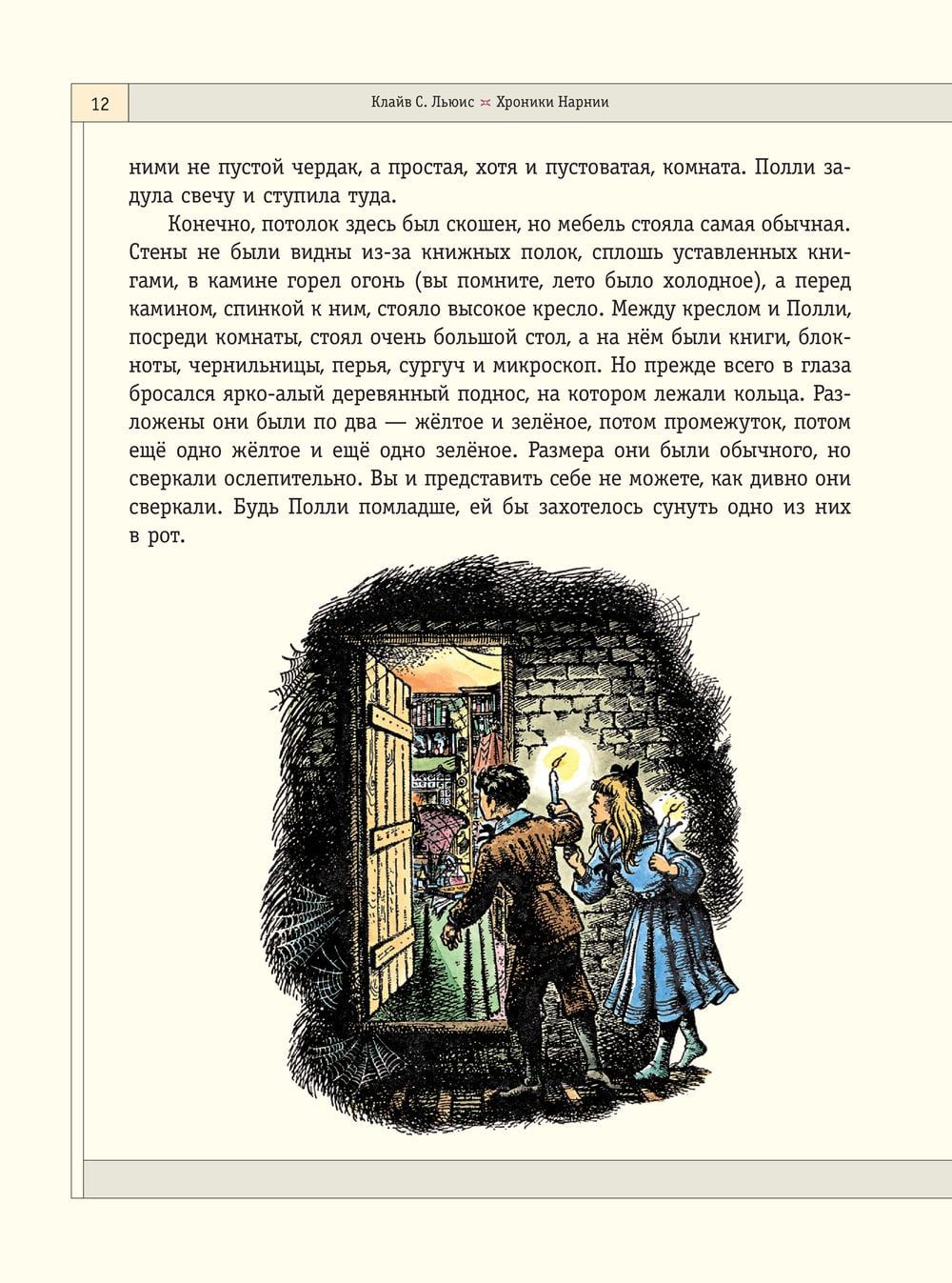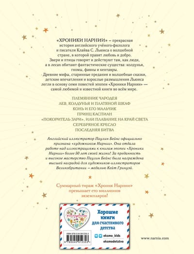 Древние мифы, старинные предания и волшебные сказки, детские впечатления и взрослые размышления английского писателя Клайва С.Льюиса легли в основу семи повестей эпопеи "Хроники Нарнии" — самой любимой и известной книги во всем мире. Книга оформлена цветными рисунками Паулин Бейнс, которая официально признана "художником Нарнии" и отдала работе над иллюстрациями к книгам эпопеи более 50 лет своей жизни.