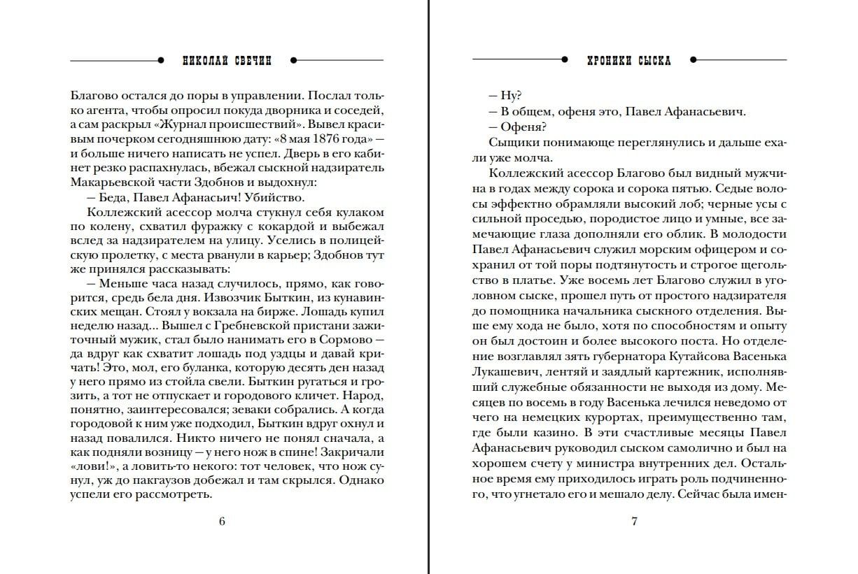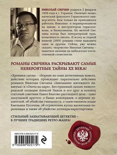 «Хроники сыска» — сборник из семи детективных новелл, действие которых происходит параллельно действию романов Николая Свечина «Завещание Аввакума» и «Охота на царя». Бесстрашный сыщик нижегородской полиции Алексей Лыков и его друг и коллега статский советник Павел Благово расследуют дела — одно запутанней другого: о банде конокрадов, о деревне душителей, об убийстве гимназиста, о таинственном кладе Емельяна Пугачева, об отравлении купца ядовитыми перепелами, а также об убийстве аптекаря-наркоторговца.