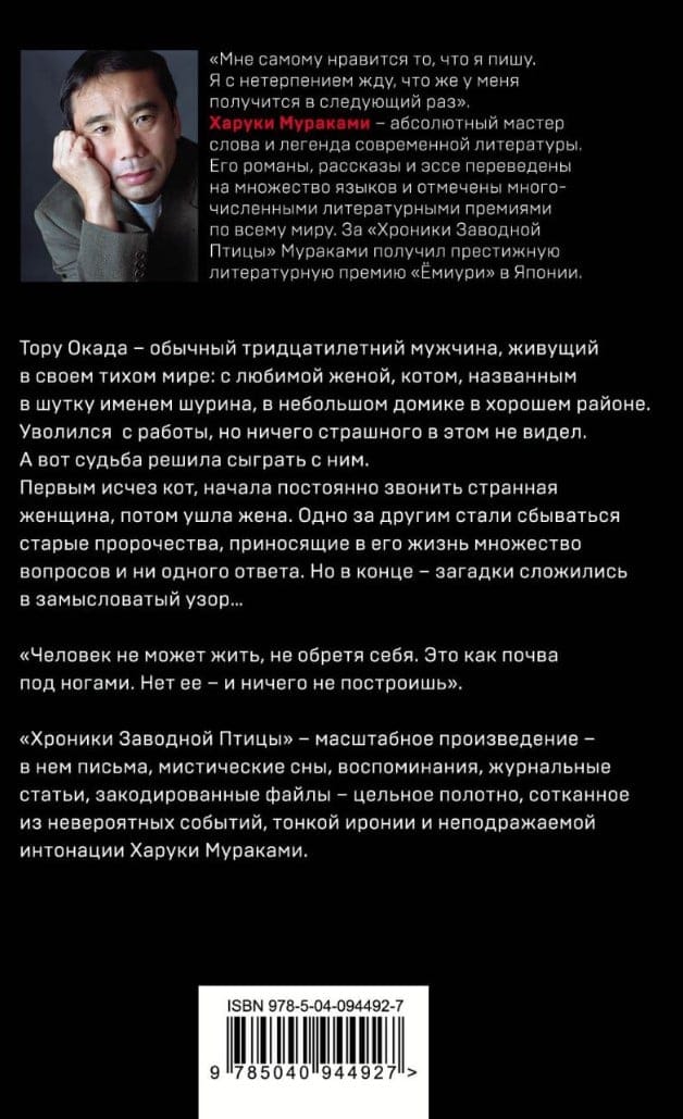 Роман "Хроники Заводной Птицы" Харуки Мураками - произведение поистине джойсовского масштаба. Ужас Второй мировой войны и судьба нашего современника в Японии, письма, мистические сны, воспоминания, журнальные статьи, закодированные файлы - цельное полотно, сотканное из невероятных событий, тонкой иронии и неподражаемой интонации Харуки Мураками.