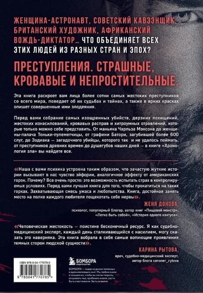 Вам кажется, что все это чья-то изощренная выдумка? К сожалению, нет. Все это не больные фантазии, а детали реальных злодеяний, описанных в этой книге. Здесь вы найдете еще больше шокирующих подробностей, описанных во всех красках. «Хронология зла. Коллекция самых жутких преступлений, которые только можно себе представить» — настоящая энциклопедия зла, которая покажет вам, с какой звериной жестокостью может совершать свои преступления человек.