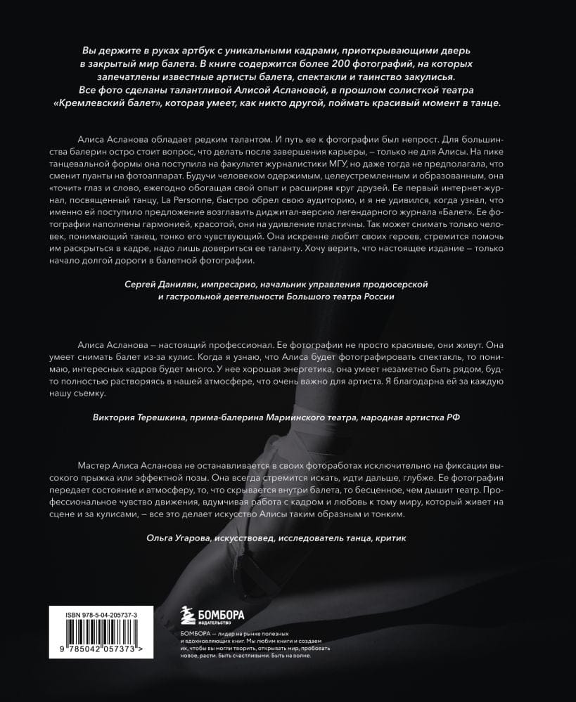 Книга, с которой можно открыть таинственный и недоступный мир закулисья и балетной фотографии. Настоящий кладезь уникальных авторских снимков, сделанных талантливой Алисой Аслановой, которая не только проведёт читателя за кулисы, но и расскажет о своём творческом пути, поиске себя и поделится опытом в создании такого сложного вида фотографии, как балетная.