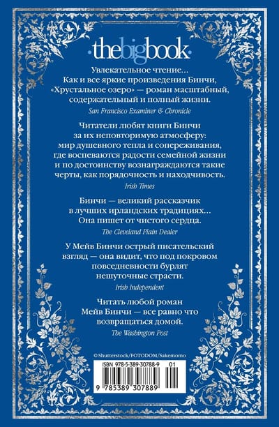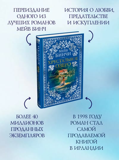 Ирландская писательница и журналистка Мейв Бинчи (1940–2012) прославилась во всем мире после выхода первого же романа «Зажги свечу». Книги Бинчи переведены на десятки языков, их совокупный тираж превышает 40 миллионов экземпляров. В 1998 году роман «Хрустальное озеро» стал самой продаваемой книгой в Ирландии. Как и знаменитый бестселлер Бинчи «Дом на Тара-роуд», он посвящен сильным женщинам в поисках счастья. Захватывающая, правдивая и горькая история о любви, предательстве и искуплении.