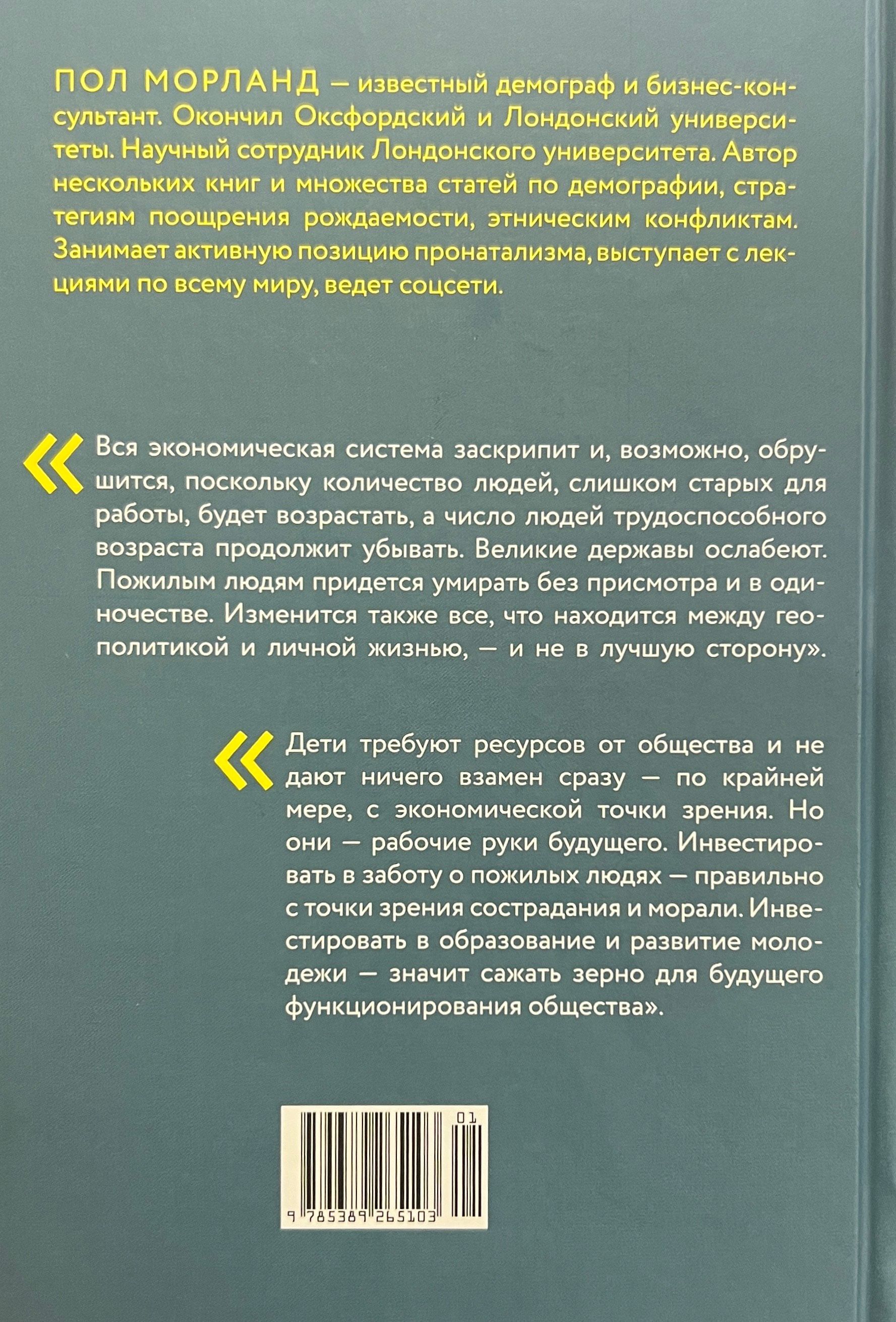 На наших глазах происходит демографическая катастрофа. Она началась в отдельных развитых странах и стремительно распространяется на весь мир. Детей рождается так мало, что человечество не способно воспроизводить себя. Ведущий британский демограф Пол Морланд утверждает, что эта тенденция приведет к разрушительным последствиям — нехватке рабочей силы, пенсионному кризису, растущему государственному долгу, дефициту идей и инноваций, исходящих от молодежи. Развитые страны, возможно, временно смягчат худшие последствия за счет иммиграции, но многие страны, в том числе и те, из которых приезжают иммигранты, состарятся раньше, чем разбогатеют. На основе статистических данных автор описывает наше безрадостное будущее, объясняет его причины и предлагает способы исправления ситуации. Если мы радикально не изменим наше отношение к родительству и не примем ценности деторождения (пронатализм), утверждает Морланд, планета Земля скоро станет необитаемой.