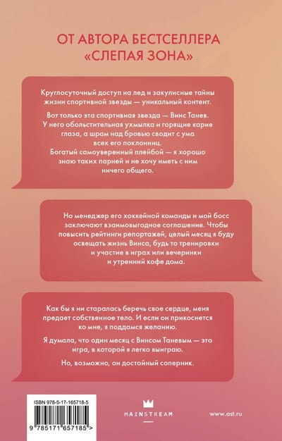 Но менеджер его хоккейной команды и мой босс заключают взаимовыгодное соглашение. Чтобы повысить рейтинги репортажей, целый месяц я буду освещать жизнь Винса, будь то тренировки и участие в играх или вечеринки и утренний кофе дома.