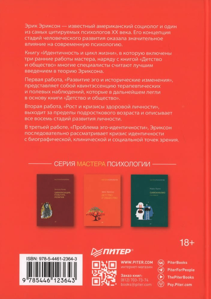 Эрик Эриксон - известный американский социолог и один из самых цитируемых психологов XX века. Его концепция стадий человеческого развития оказала значительное влияние на современную психологию. Книгу «Идентичность и цикл жизни», в которую включены три ранние работы мастера, наряду с книгой «Детство и общество» многие специалисты считают лучшим введением в теорию Эриксона.