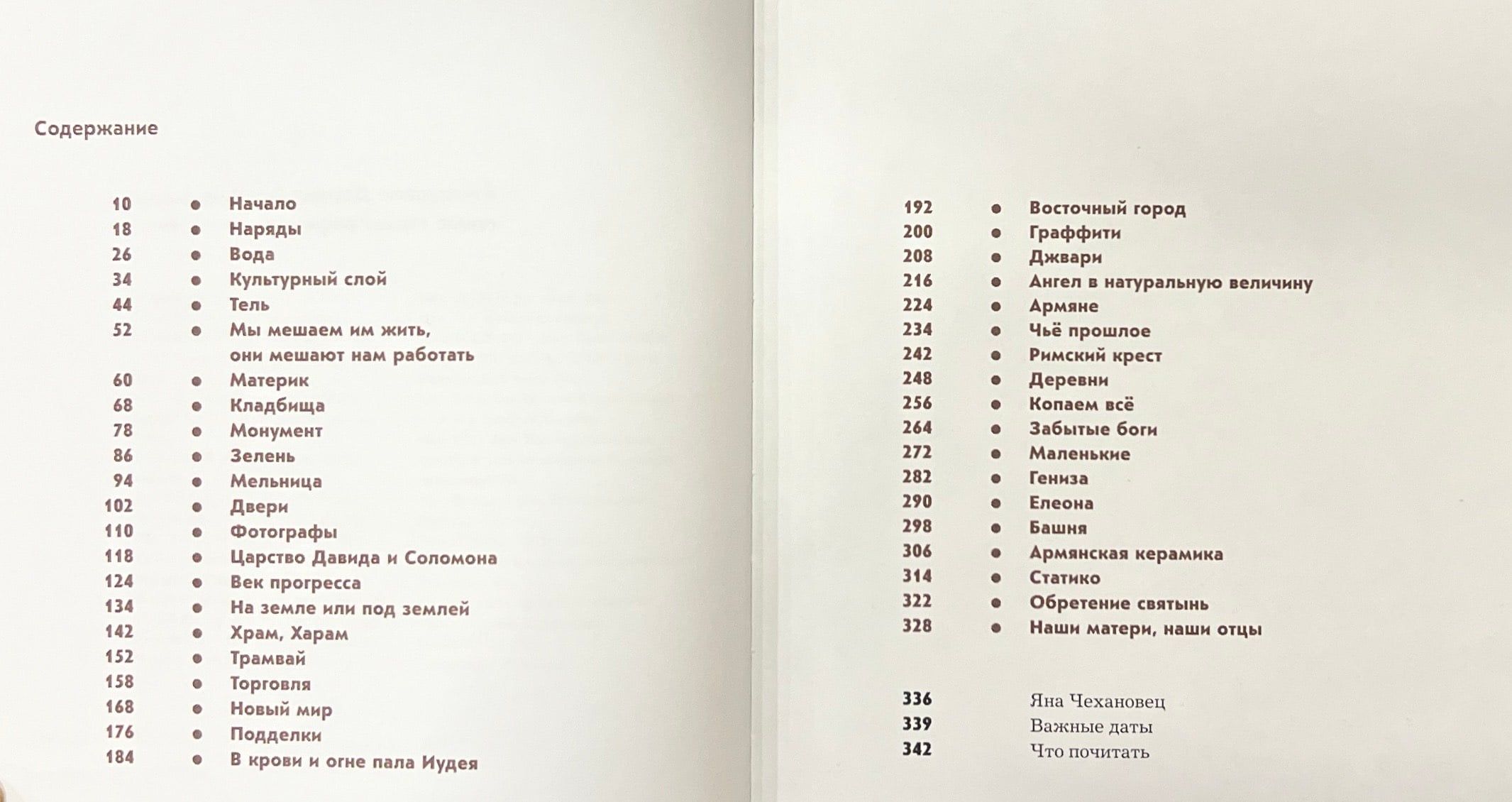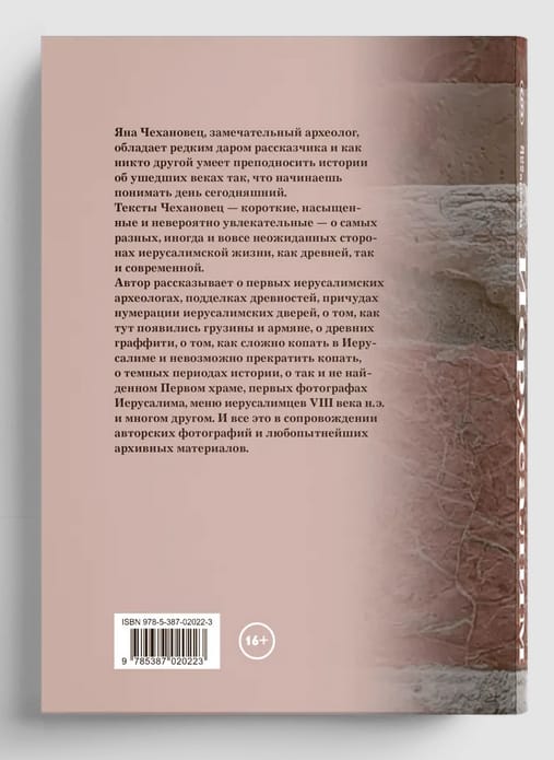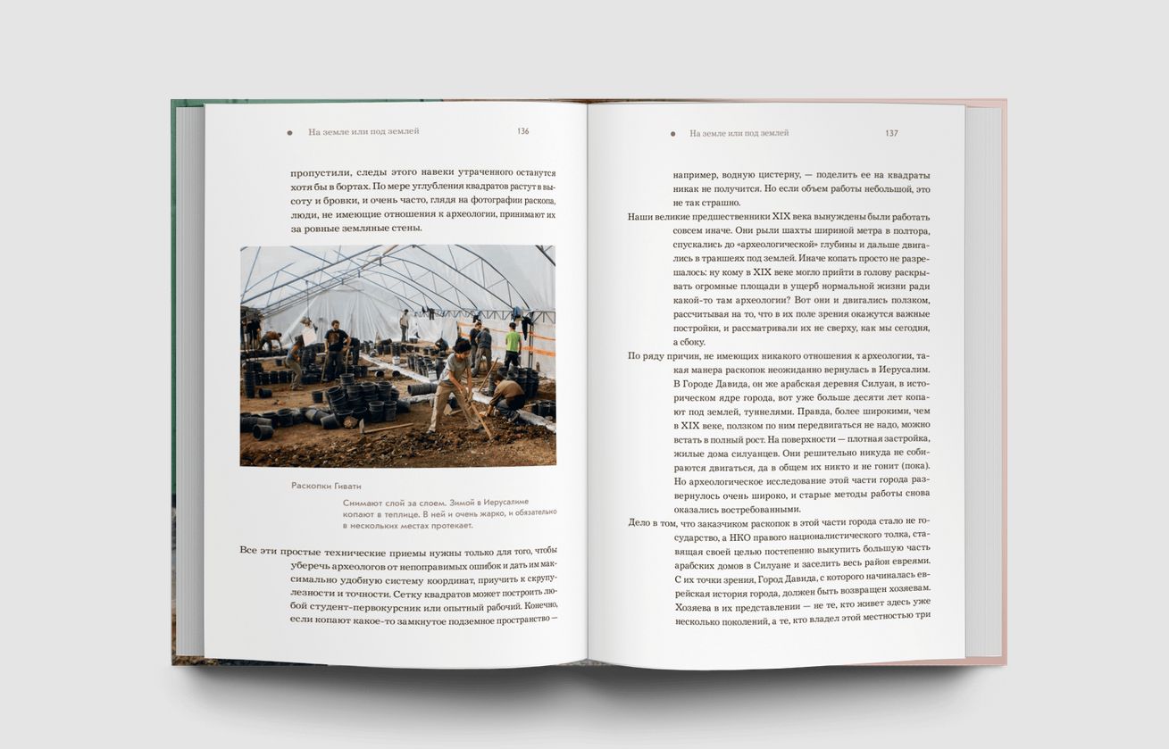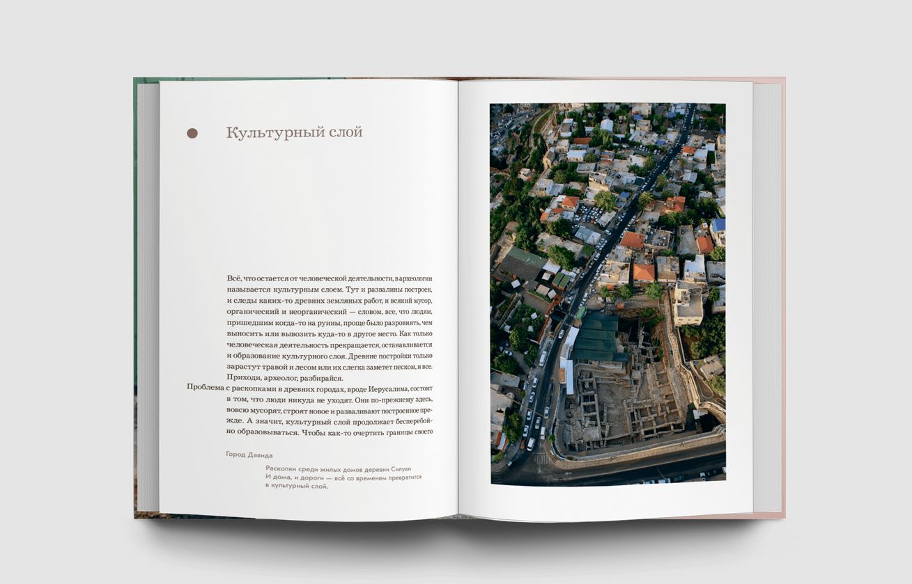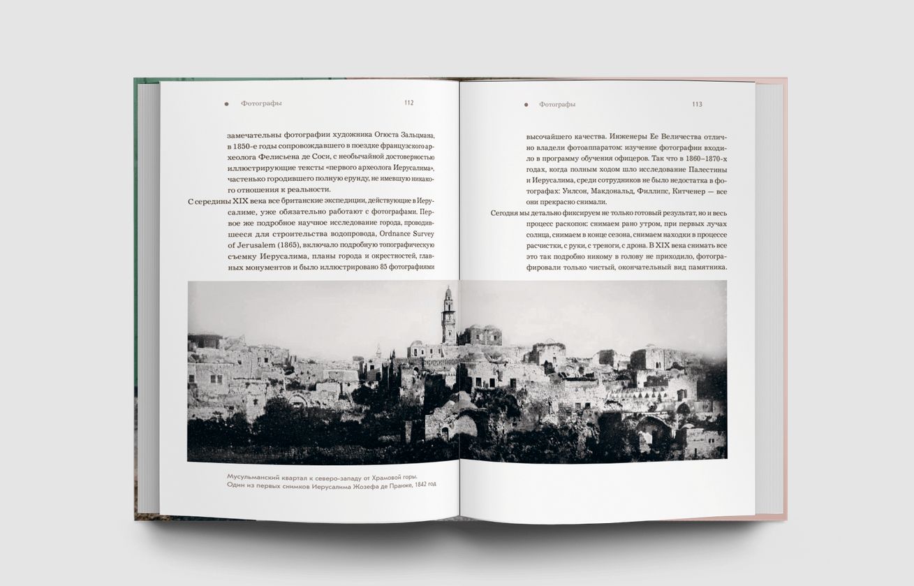 В своей книге автор рассказывает о первых иерусалимских археологах, подделках древностей, причудах нумерации иерусалимских дверей, о том, как тут появились грузины и армяне, о древних граффити, о том, как сложно копать в Иерусалиме и невозможно прекратить копать, о темных периодах истории, о так и не найденном первом храме, первых фотографах Иерусалима, меню иерусалимцев VIII века н. э. и многом другом. И все это в сопровождении авторских фотографий и любопытнейших архивных материалов.