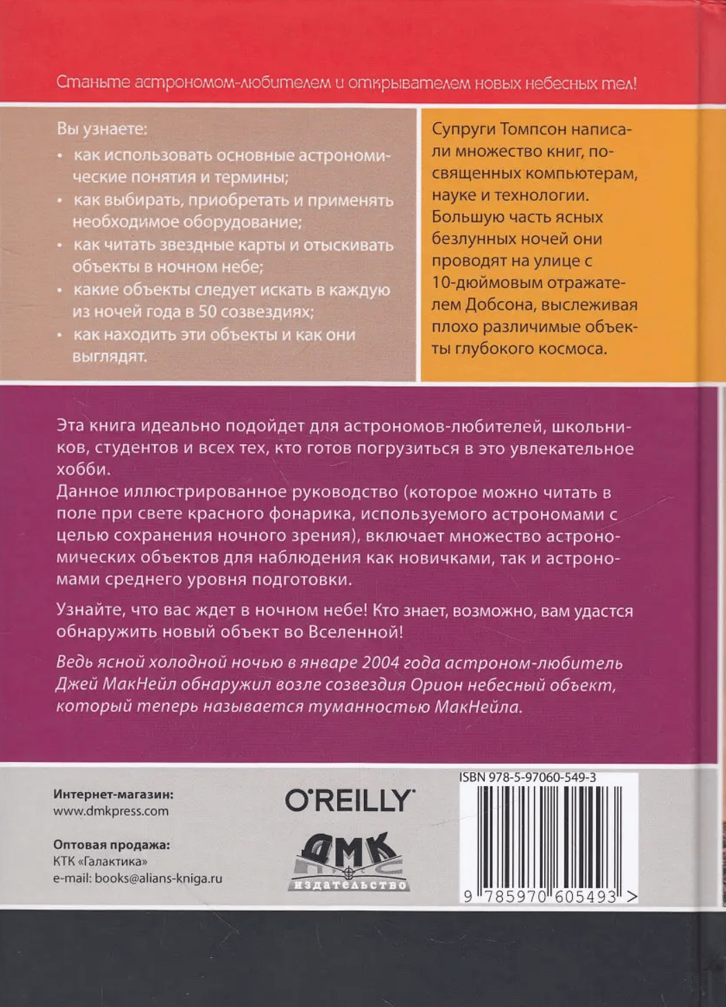 Данное иллюстрированное руководство включает множество астрономических объектов для наблюдения как новичками, так и астрономами среднего уровня подготовки. Вы узнаете, как использовать основные астрономические понятия и термины, как выбирать, приобретать и применять необходимое оборудование, как читать звездные карты и отыскивать объекты в ночном небе, какие объекты следует искать в каждую из ночей года в 50 созвездиях, как находить эти объекты и как они выглядят.