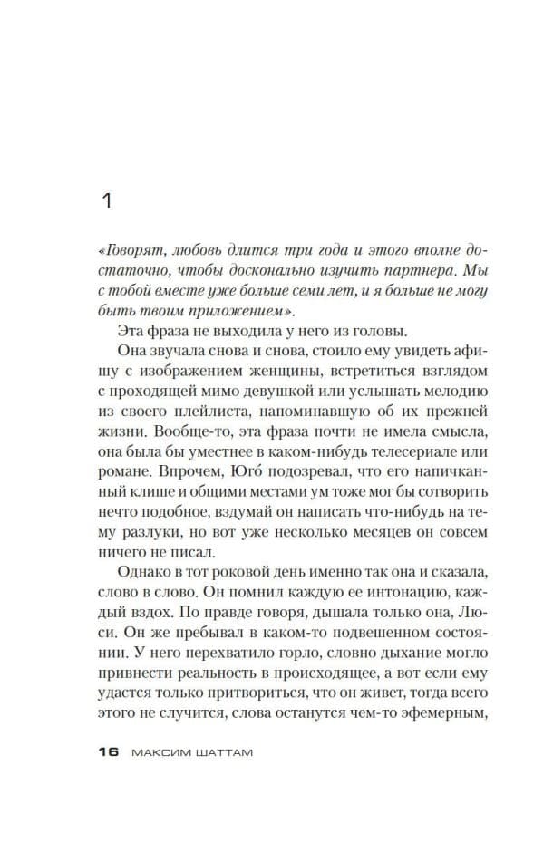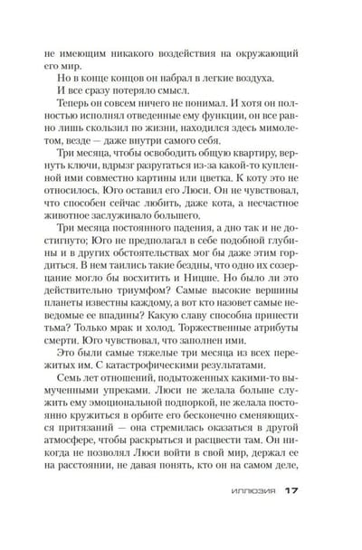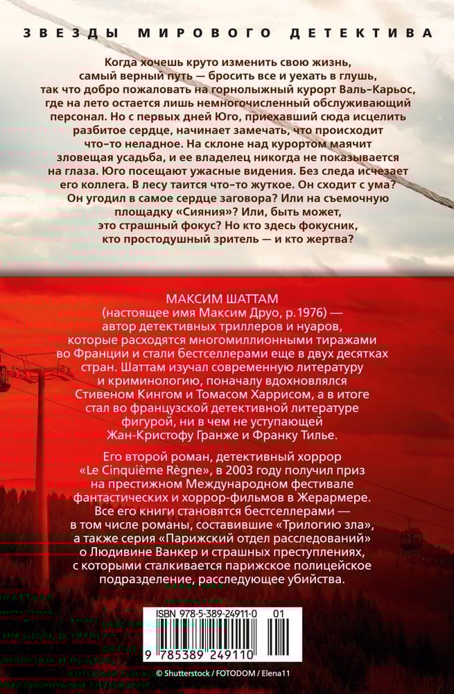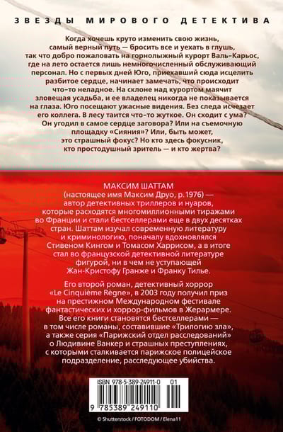 Когда хочешь круто изменить свою жизнь, самый верный путь — бросить все и уехать в глушь, так что добро пожаловать на горнолыжный курорт Валь-Карьос, где на лето остается лишь немногочисленный обслуживающий персонал. Дикая природа, ни души на много километров вокруг — что может быть целебнее для разбитого сердца Юго, только что пережившего тяжелое расставание? Но с первых же дней Юго начинает замечать, что происходит что-то неладное. На склоне над курортом маячит зловещая усадьба, и ее владелец никогда не показывается на глаза. Юго посещают ужасные видения, чего с ним раньше никогда не случалось. Без следа исчезает его коллега. В лесу таится что-то неведомое, но явно жуткое. Никого, кроме Юго, все это как будто не волнует. Он сходит с ума? Он нечаянно угодил в самое сердце заговора? Или на съемочную площадку «Сияния»? Или, быть может, это страшный фокус? Но кто здесь фокусник, кто простодушный зритель — и кто жертва? Максим Шаттам — автор детективных триллеров и нуаров, которые расходятся многомиллионными тиражами во Франции и стали бестселлерами еще в двух десятках стран. Шаттам изучал современную литературу и криминологию, поначалу вдохновлялся Стивеном Кингом и Томасом Харрисом, а в итоге стал во французской детективной литературе фигурой, ни в чем не уступающей Жан-Кристофу Гранже и Франку Тилье. Его новый триллер «Иллюзия» постепенно и неотвратимо заводит читателя все дальше в беспросветный лабиринт, где за каждым углом таятся чудовища и все новые ловушки, а выхода к свету, возможно, и вовсе нет.