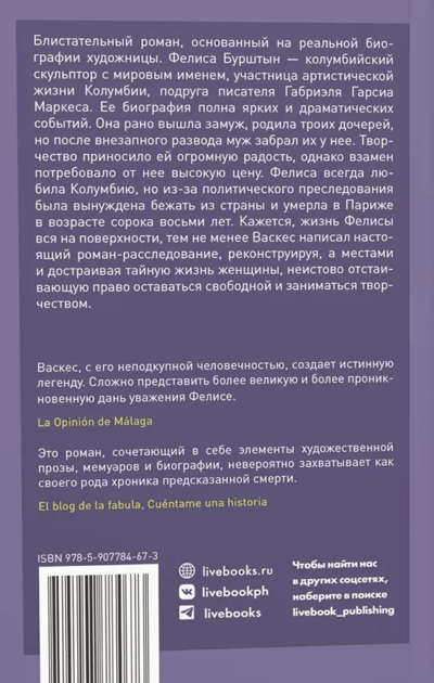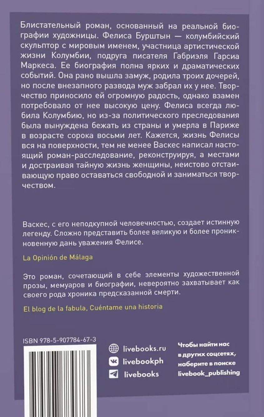 Блистательный роман, основанный на реальной биографии художницы. Фелиса Бурштын – колумбийский скульптор с мировым именем, участница артистической жизни Колумбии, подруга писателя Габриэля Гарсиа Маркеса. Её биография полна ярких и драматических событий. Она рано вышла замуж, родила троих дочерей, но после внезапного развода муж забрал их у неё.