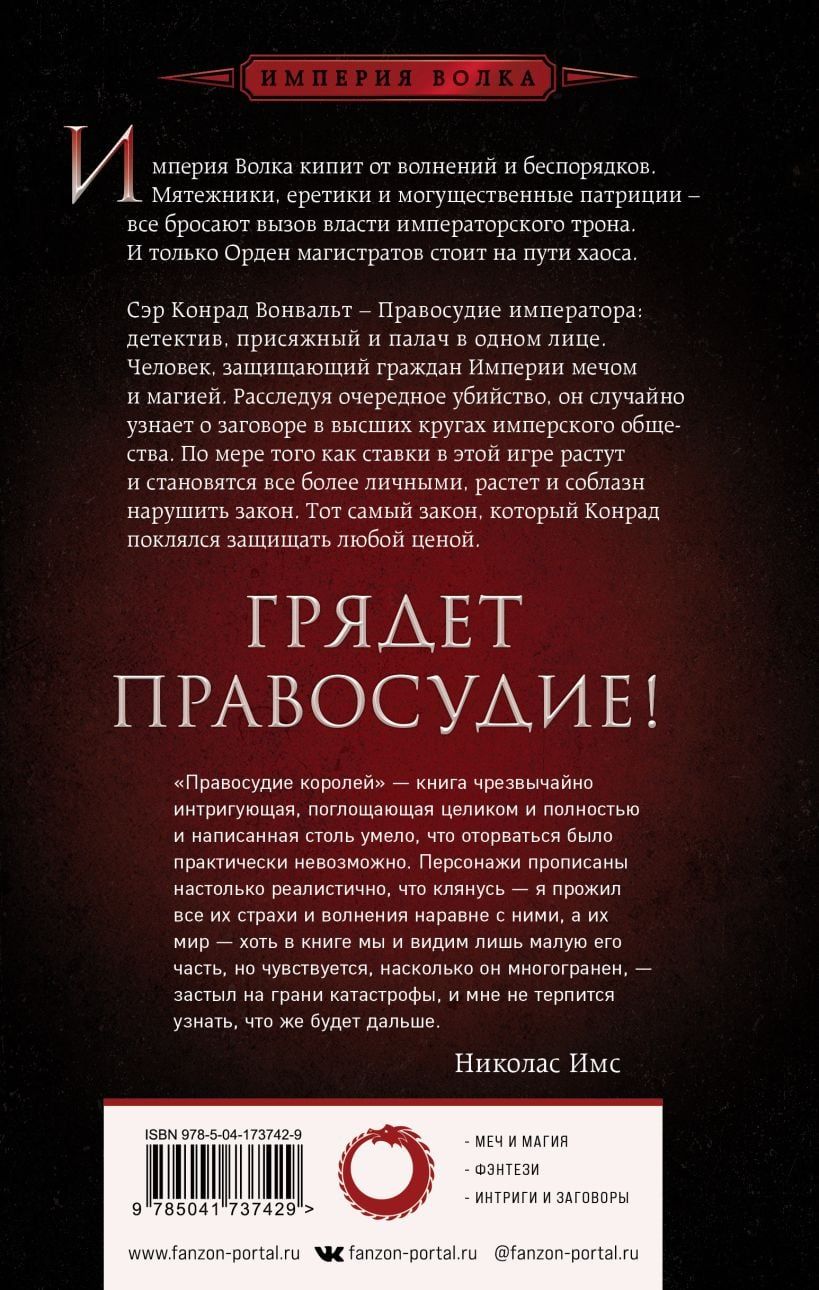 Интриги и магия сталкиваются в этом эпическом фэнтези о сэре Конраде Вонвальте, Правосудии императора, который является детективом, судьей и палачом в одном лице. Империя Волка кипит от волнений и беспорядков. Мятежники, еретики и могущественные патриции — все они бросают вызов могуществу императорского трона. Это опасные времена для Правосудия. Только Орден магистратов стоит на пути хаоса. Сэр Конрад Вонвальт — самый страшный судья из всех, отстаивающий закон благодаря своему острому уму, магии и мастерству фехтовальщика. Когда Вонвальт вместе со своей протеже расследуют убийство, то раскрывают заговор, который тянется к самым верхам имперского общества. Ставки растут и становятся все более личными, и Вонвальт оказывается перед соблазном нарушить закон. Но стоит ли даже самая высшая цель такой жертвы?