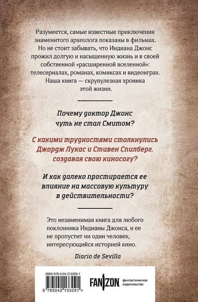 Эта книга — самая подробная на сегодняшний день работа об одном из любимейших персонажей современного кино. Первая полная биография Индианы Джонса, история его путешествий, исследований и личной жизни в хронологическом порядке, как они представлены в кинофильмах, телесериале, комиксах, романах и видеоиграх. Помимо истории персонажа, Сальва Рубио собрал воедино источники, вдохновившие его легендарных создателей, Джорджа Лукаса и Стивена Спилберга, а также варианты сюжета, которые сценаристы придумали, но так и не воплотили в жизнь. Он также исследует культурное влияние, которое самый знаменитый обладатель кнута и шляпы оказал на поколения зрителей.