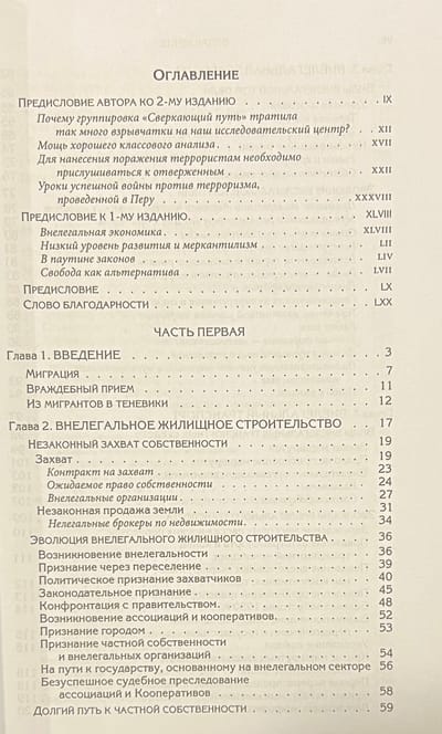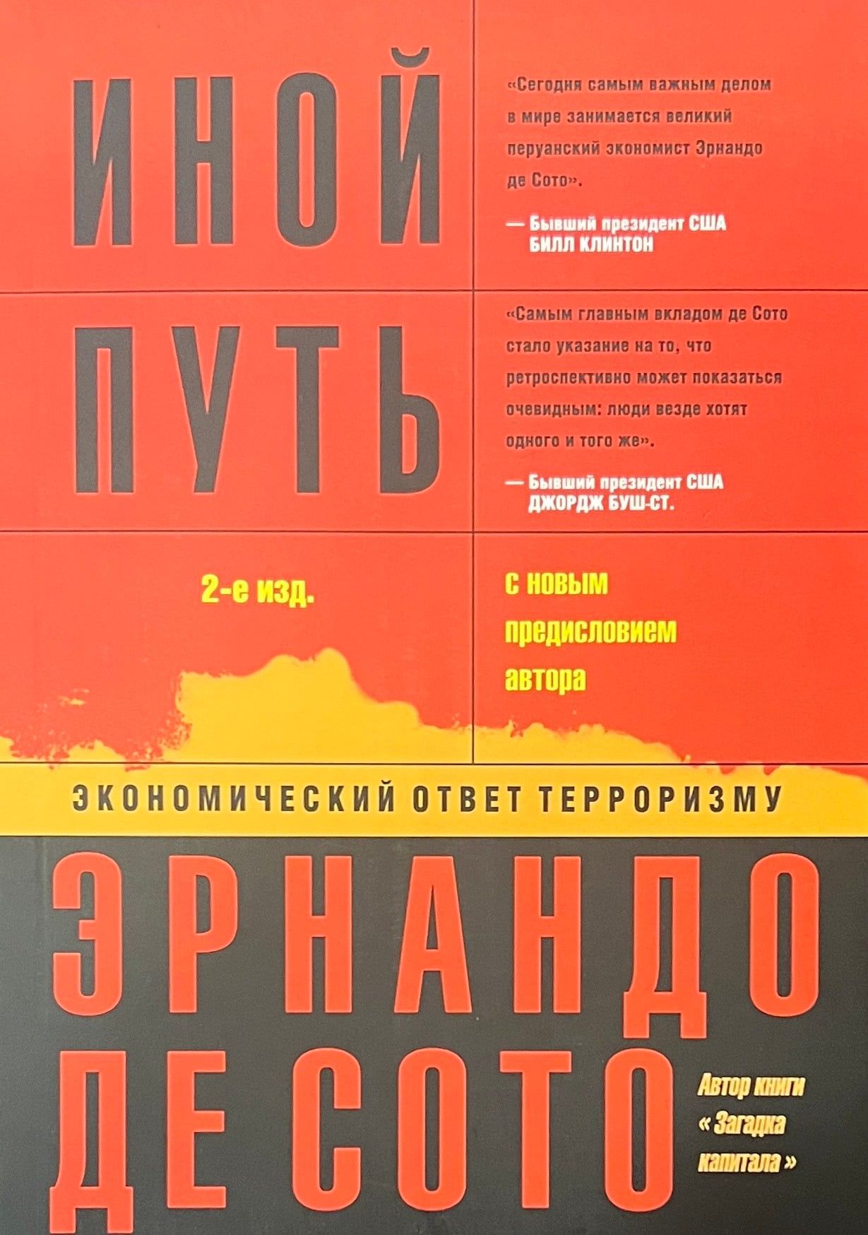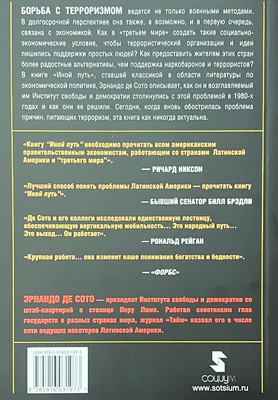 Книга ведущего перуанского экономиста Э. де Сото, в 1989—1996 гг. экономического советника президента Перу, начавшего рыночные реформы в охваченной гражданской войной, отсталой и нищей стране, была буквально бестселлером в 80-е годы не только в Перу, но и во всей Латинской Америке. Де Сото сумел на громадном эмпирическом материале доказать, что причины нищеты и от-сталости Перу — источник взаимной вражды и беззакония — коренятся в несовершенстве законов о собственности, в первую очередь о собственности на землю. Легализация частной собственности, дебюрократизация экономики и сокращение правительственного вмешательства в хозяйственную деятельность есть единственный путь к гражданскому миру и процветанию — этот вывод де Сото особенно актуален для России. Для второго издания, вышедшего в 2002 г. автор написал большое предисловие, где рассказывает о том, как про-ведение экономических реформ в Перу помогло этой стране справится с террористическим движением «Сверкающий путь». Именно в пику названию этой террористической организации книга получила название «Иной путь». Автор известен российским читателям книгой «Загадка капитала: Почему капитализм торжествует на Западе и терпит поражение во всем остальном мире».