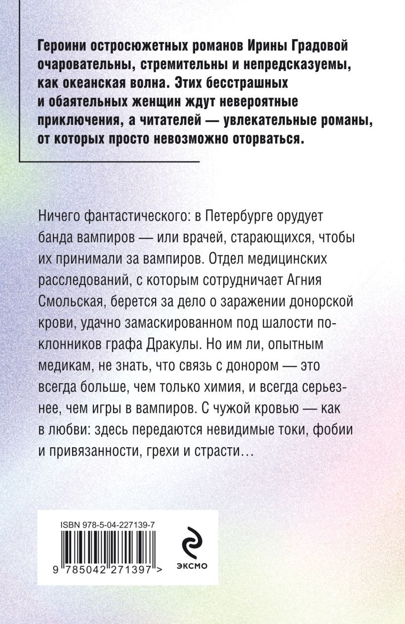 Ничего фантастического: в Петербурге орудует банда вампиров — или врачей, которым хочется, чтобы их принимали за вампиров. Отдел медицинских расследований, с которым сотрудничает Агния Смольская, берется за дело о заражении донорской крови, удачно замаскированном под шалости поклонников графа Дракулы. Но им ли, опытным медикам, не знать, что связь с донором — это всегда больше, чем только химия, и всегда серьезнее, чем игры в вампиров. С чужой кровью — как в любви: здесь передаются невидимые токи, фобии и привязанности, грехи и страсти…