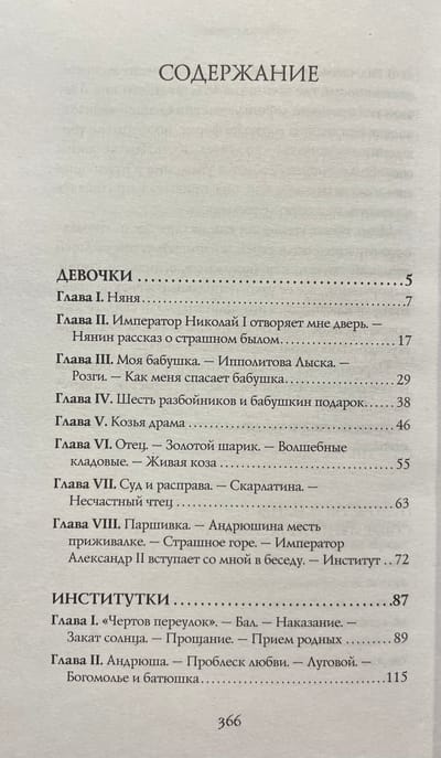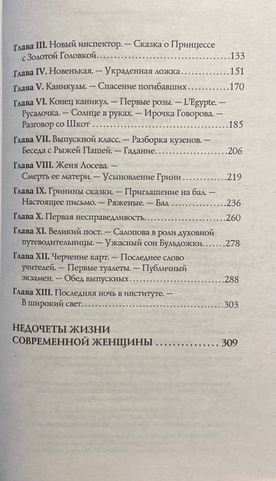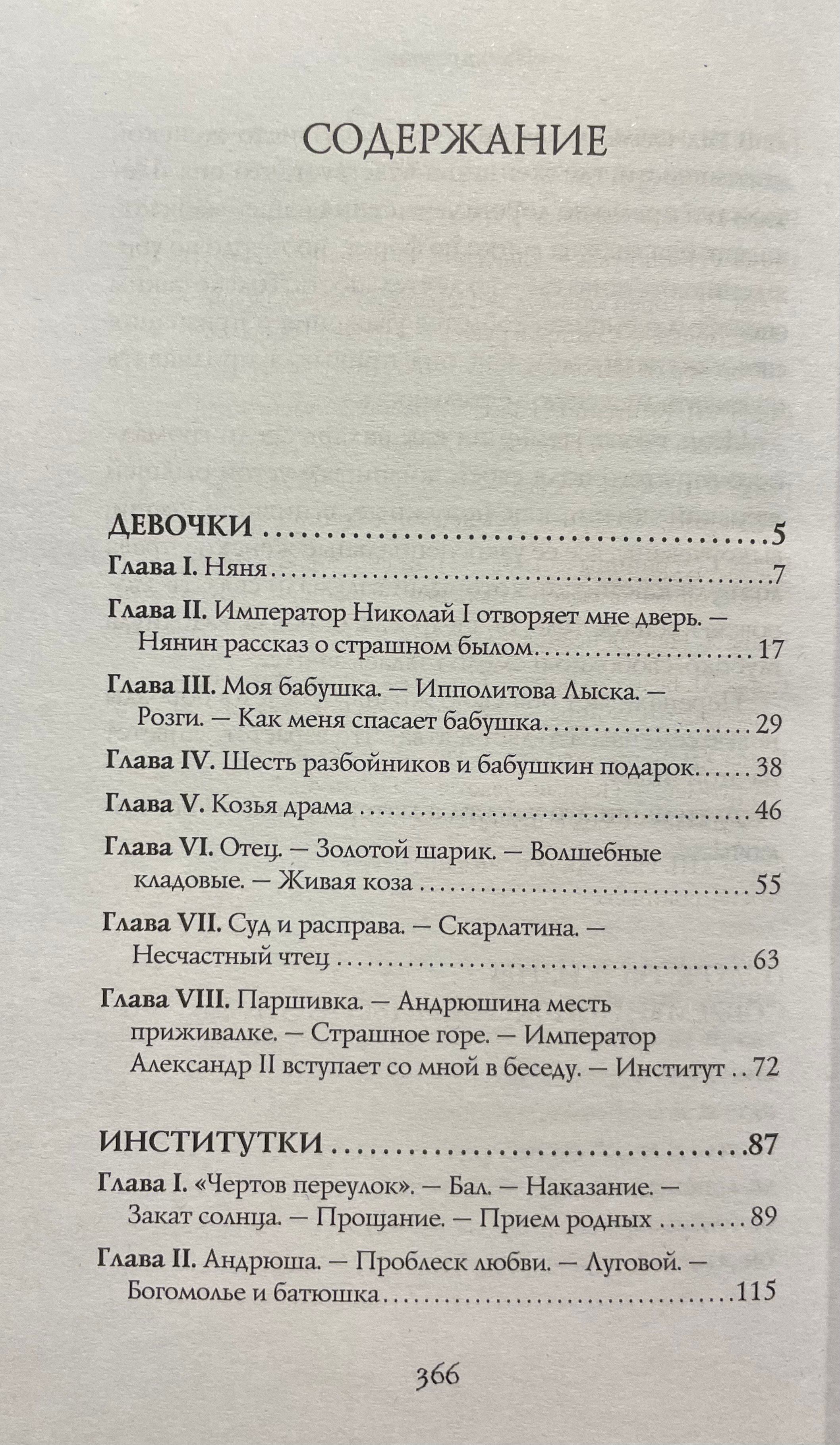Вместе с лучшей подругой Людой Шкот и другими девочками – Бульдожкой, Пышкой, Чернушкой и Русалочкой, — Надя переживает радости и печали институтской жизни. Здесь редкие встречи с родными, наказания директрисы, увольнение любимого воспитателя, а еще — мелкие шалости и проказы, робкие попытки бунтарства, первая любовь и первые потери.