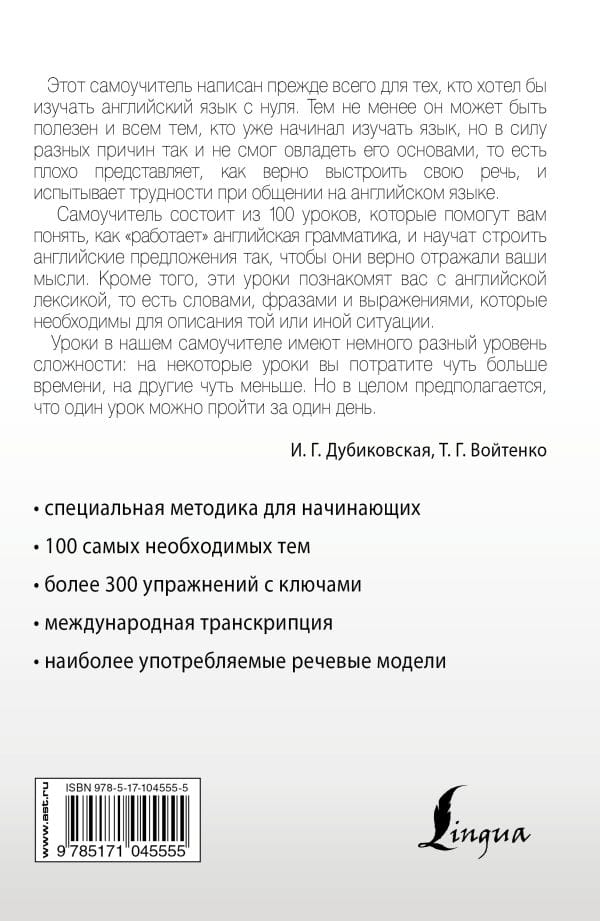 Данное учебное пособие содержит лексический и грамматический материал для изучения английского языка с нулевого уровня до уровня pre-intermediate (A2/B1). Курс разбит на 100 относительно небольших, но насыщенных уроков и рассчитан на прохождение в течение 100 дней, то есть на освоение 1 урока потребуется 1 день. Для отработки языковых навыков и речевых умений предлагается большое количество упражнений, ключи к которым расположены в конце книги. Пособие также научит вас работать с текстами на английском языке и сообщит базовые сведения о культуре современного англоязычного мира. Книга адресован всем, кто хочет овладеть английским языком, не слишком затягивая процесс изучения, и готов к интенсивным самостоятельным занятиям.