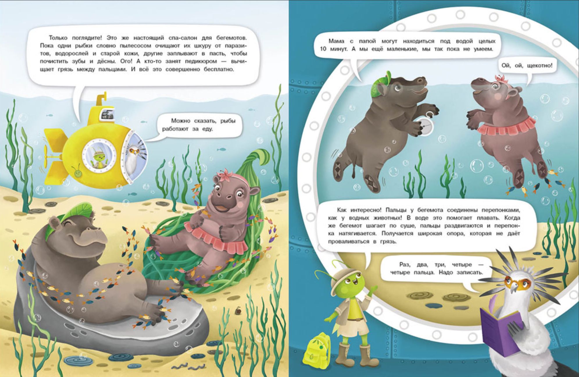 Кузнечик Пружинка – репортер в мире животных. В его волшебном рюкзаке найдется все, что поможет взять интервью у любого животного: и в непроходимых джунглях, и в жаркой Африке глубоко под водой и высоко в небе. В каждом путешествии Пружинку ждут невероятные открытия, новые друзья и удивительные приключения. Репортер Пружинка не испугался сходить на интервью к огромным бегемотам и задать им несколько вопросов.