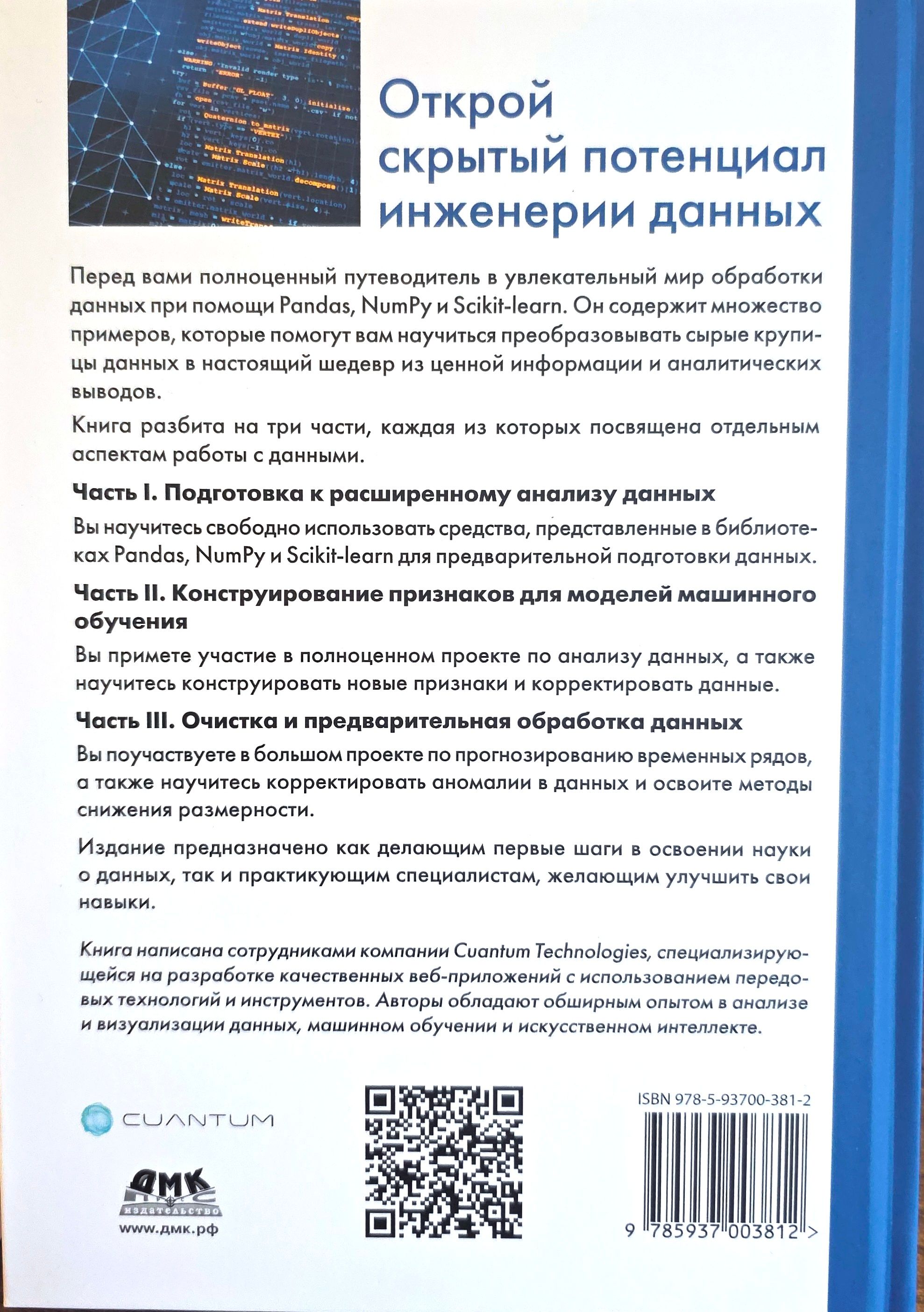 Издание предназначено как делающим первые шаги в освоении науки о данных, так и практикующим специалистам, желающим улучшить свои навыки.
