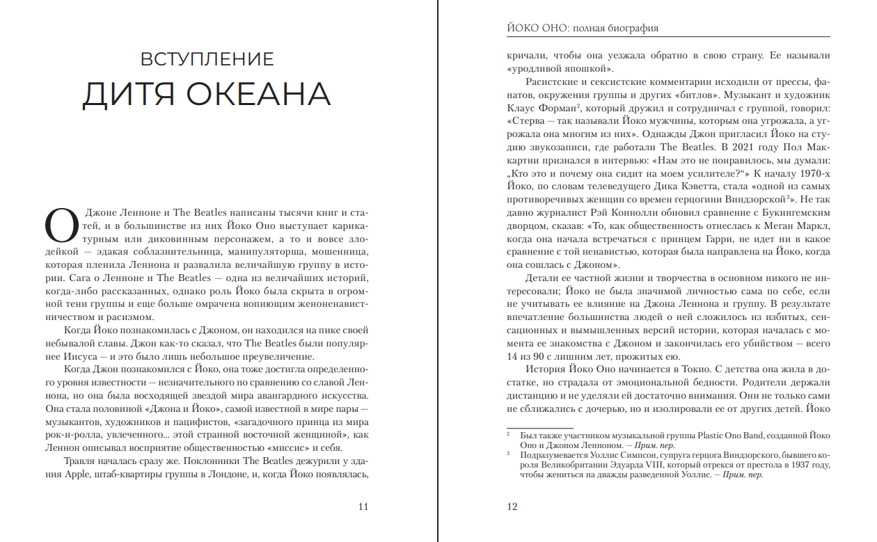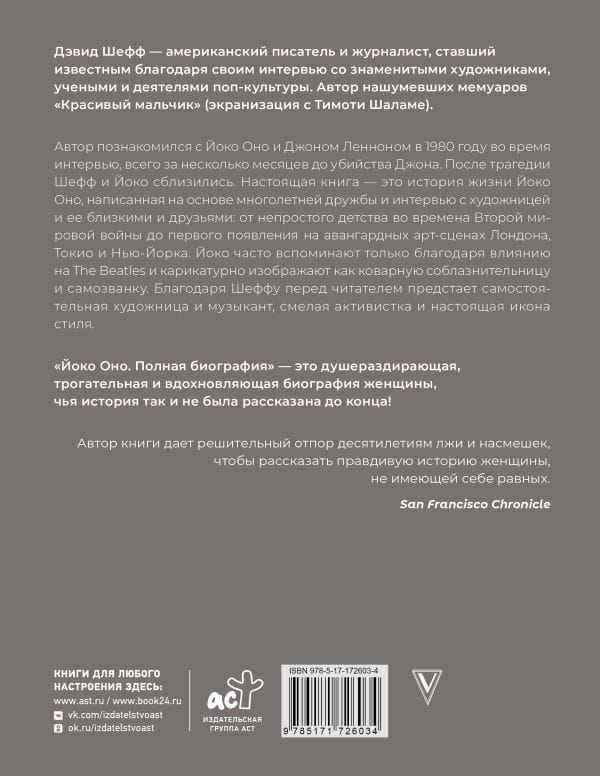 Автор познакомился с Йоко Оно и Джоном Ленноном в 1980 году во время интервью, всего за несколько месяцев до убийства Джона. После трагедии Шефф и Йоко сблизились. Настоящая книга — это история жизни Йоко Оно, написанная на основе многолетней дружбы и интервью с художницей и ее близкими и друзьями: от непростого детства во времена Второй мировой войны до первого появления на авангардных арт-сценах Лондона, Токио и Нью-Йорка. Йоко часто вспоминают только благодаря влиянию на The Beatles и карикатурно изображают как коварную соблазнительницу и самозванку. Благодаря Шеффу перед читателем предстает самостоятельная художница и музыкант, смелая активистка и настоящая икона стиля.