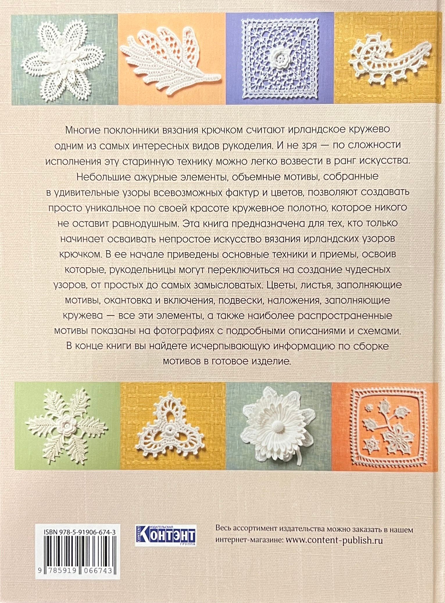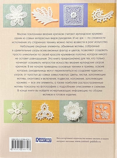Эта книга предназначена для тех, кто только начинает осваивать непростое искусство вязания ирландских узоров крючком. В ее начале приведены основные техники и приемы, освоив которые, рукодельницы могут переключиться на создание чудесных узоров, от простых до самых замысловатых.