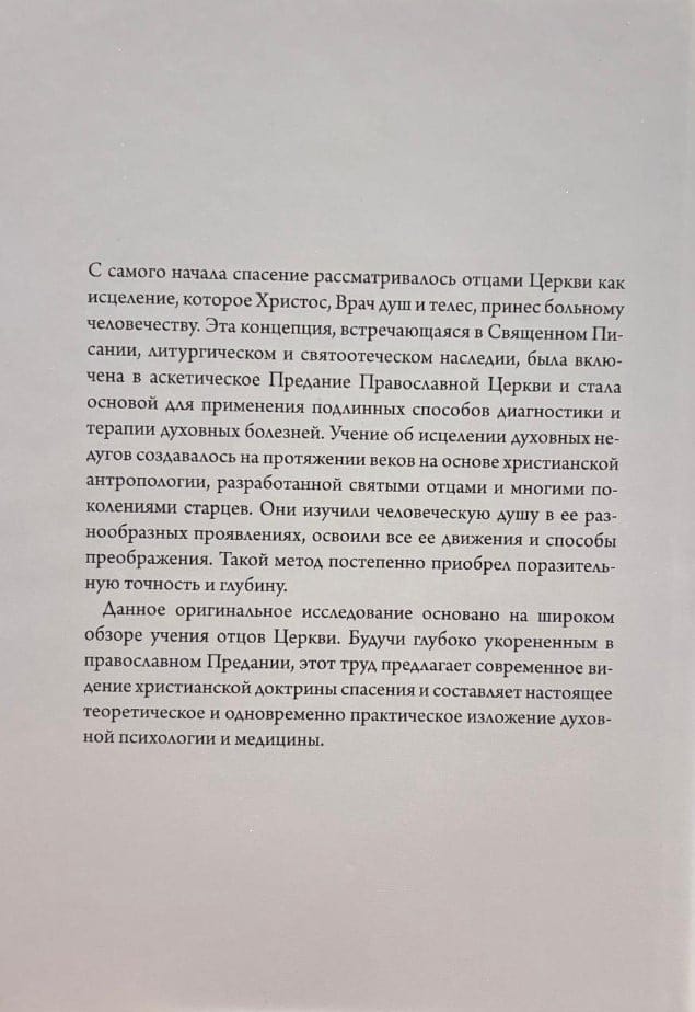 Данное оригинальное исследование основано на широком обзоре наследия святых отцов, писавших на греческом, латинском и других языках христианского Востока. Будучи глубоко укорененным в православном Предании, этот труд предлагает современное видение христианской доктрины спасения и составляет настоящее теоретическое и одновременно практическое изложение духовной психологии и медицины.