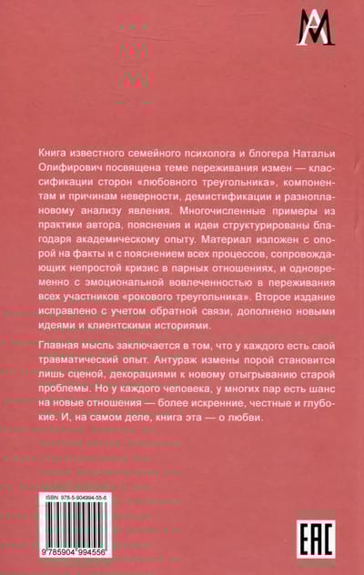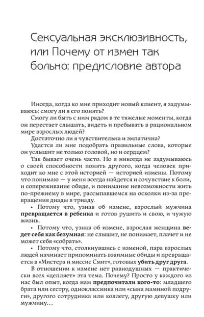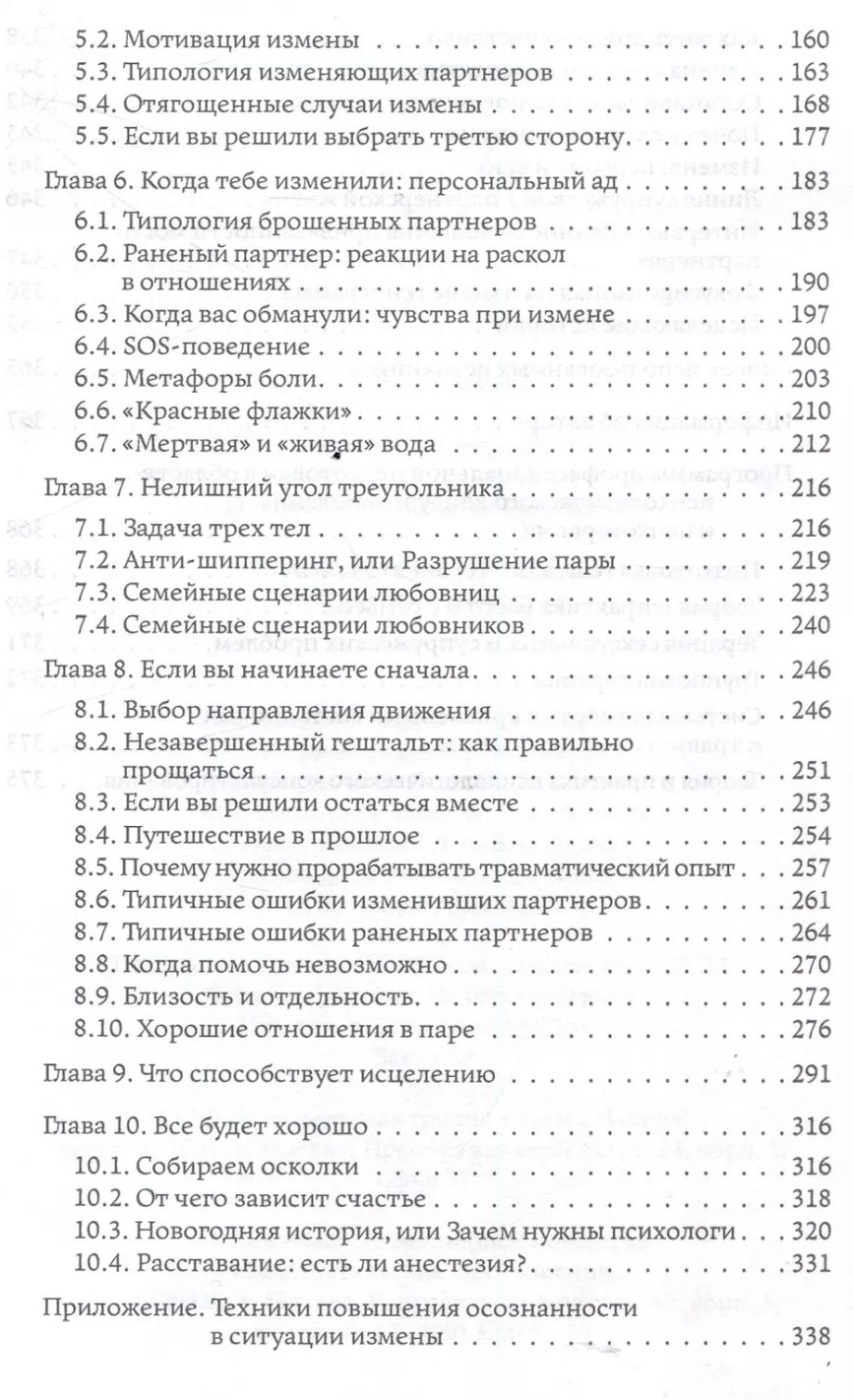 Главная идея книги заключается в том, что у всех есть свой травматический опыт и измена зачастую становится сценой, где наше раненое Я играет старую пьесу в новом издании. Именно поэтому автор считает, что у каждой пары есть шанс на новые отношения — более искренние, честные и глубокие. Но для этого нужно пройти определенные шаги, о которых вы подробнее узнаете, прочитав книгу.