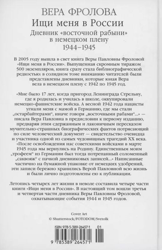 В 2005 году вышла в свет автобиографическая книга Веры Павловны Фроловой «Ищи меня в России». Выпущенная скромным тиражом 500 экземпляров, книга немедленно стала библиографической редкостью: в солидном томе вниманию читателей были представлены дневники, которые юная Вера вела в немецком плену с 1942 по 1945 год. «Мне было 17 лет, когда пригород Ленинграда Стрельну, где я родилась и училась в школе, оккупировали немецко-фашистские войска. А весной 1942 года нацисты угнали меня с мамой в Германию, где мы стали «остарбайтерами», иначе говоря «восточными рабами»...» — писала Вера Павловна в предисловии к первому изданию, предваряя этим сдержанным и лаконичным пересказом мучительно-страшных биографических фактов потрясающий по силе человеческий документ — свидетельство очевидца и участника одной из самых чудовищных трагедий XX века. «После освобождения нас советскими войсками в марте 1945 года мы вернулись на Родину. Единственным моим „трофеем“ из Германии был тогда потрепанный соломенный «саквояж» с пачкой дневниковых записей...» Написанные частично на бумажной упаковке от немецких удобрений, эти записи бережно хранились Верой Павловной всю жизнь и были лично подготовлены ею к публикации. Летопись четырех лет жизни в неволе составила четыре части книги «Ищи меня в России».