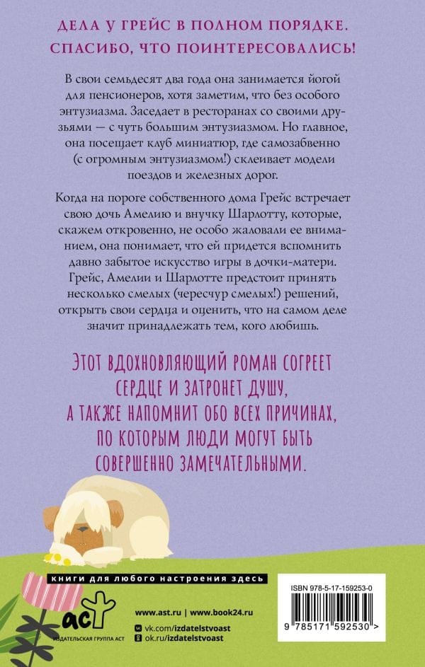 В свои семьдесят два года она занимается йогой для пенсионеров, хотя заметим, что без особого энтузиазма. Заседает в ресторанах со своими друзьями — с чуть большим энтузиазмом. Но главное, она посещает клуб миниатюр, где самозабвенно (с огромным энтузиазмом) склеивает модели поездов и железных дорог. Когда на пороге собственного дома Грейс встречает свою дочь Амелию и внучку Шарлотту, которые, скажем откровенно, не особо жаловали ее вниманием, она понимает, что ей придется вспомнить давно забытое искусство игры в дочки-матери. Грейс, Амелии и Шарлотте предстоит принять несколько смелых (чересчур смелых) решений, открыть свои сердца и оценить, что на самом деле значит принадлежать тем, кого любишь. Этот вдохновляющий роман согреет сердце и затронет душу, а также напомнит обо всех причинах, по которым люди могут быть совершенно замечательными.