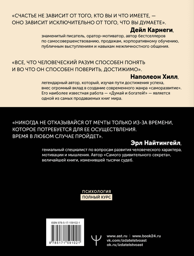 Дейл Карнеги, Наполеон Хилл и Эрл Найтингейл — легендарные авторы, чьи книги занимают верхние строчки рейтингов на протяжении десятков лет, их продолжают читать и цитировать, передавая ценнейшие мысли и советы из поколения в поколение. Книг на тему успеха написано множество, но ни одна их них не смогла затмить успех трудов Карнеги, Хилла и Найтингейла.