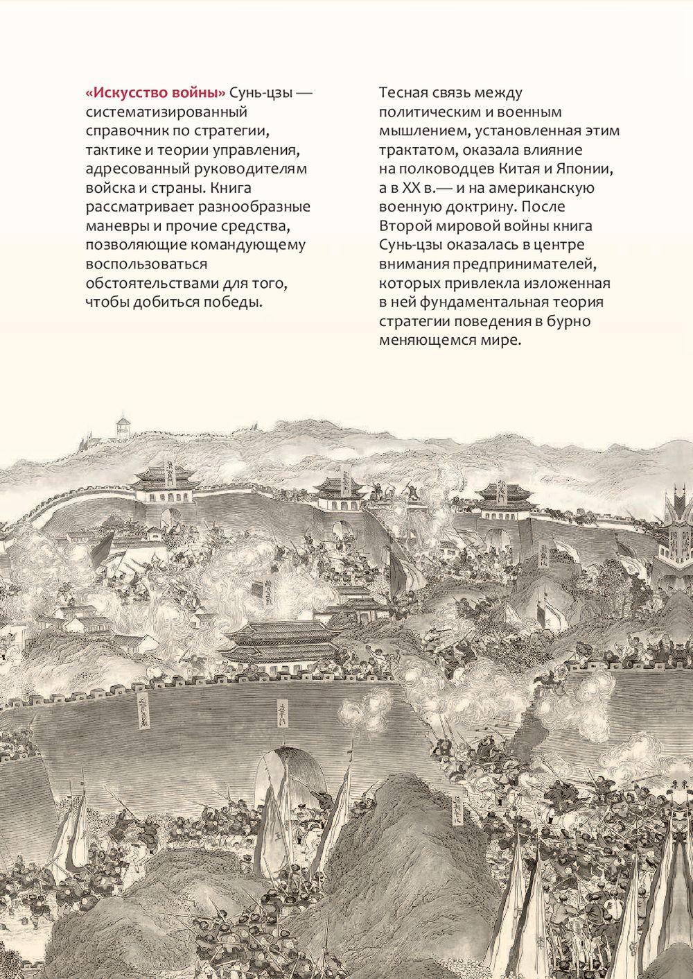 Живший за полтора века до Александра Македонского крупнейший военачальник и военный теоретик древнего Китая Сунь Цзы (VI—V вв. до н. э.) известен не только своими славными победами над врагами, но и тем, что оставил потомкам бессмертную книгу. Его знаменитый трактат о военной стратегии «Искусство войны» вот уже две с половиной тысячи лет читают все те, кто интересуется китайскими древностями, воинским искусством, политической историей, развитием человеческой мысли. А главное: бизнес-потенциал «Искусства войны» намного превосходит историко-культурный.