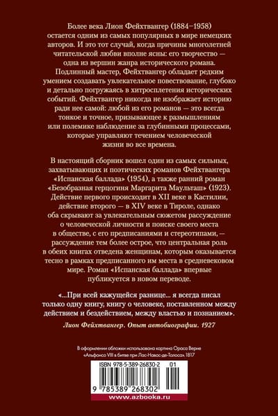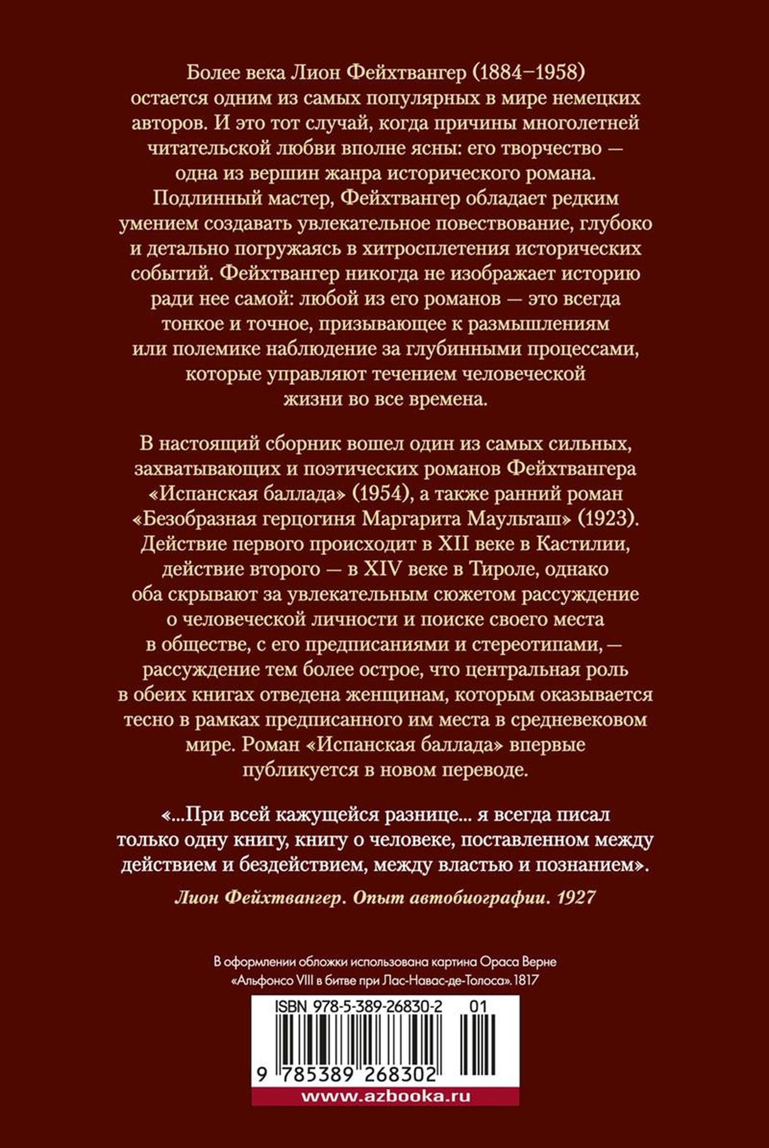 В настоящий сборник вошли один из самых сильных, захватывающих и поэтических романов Фейхтвангера «Испанская баллада» (1954), а также ранний роман «Безобразная герцогиня Маргарита Маульташ» (1923). Действие первого происходит в XII веке в Кастилии, действие второго — в XIV веке в Тироле, однако оба они скрывают за увлекательным сюжетом рассуждение о человеческой личности и поиске своего места в обществе, с его предписаниями и стереотипами, — рассуждение тем более острое, что центральная роль в обеих книгах отведена женщинам, которым оказывается тесно в рамках предписанного им места в средневековом обществе.