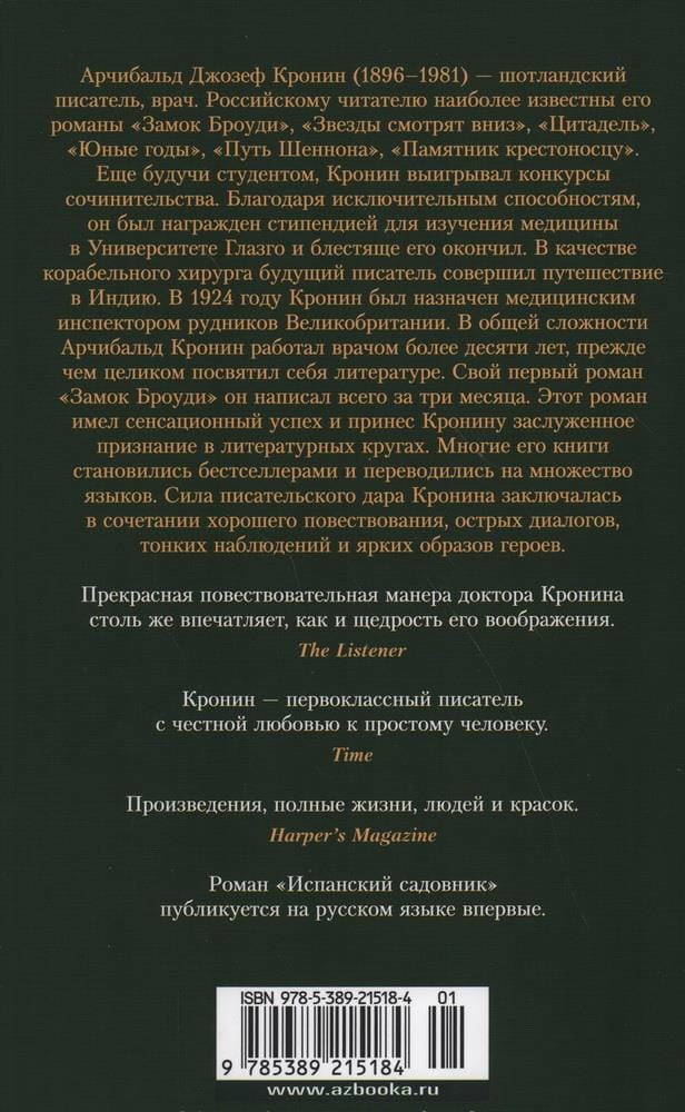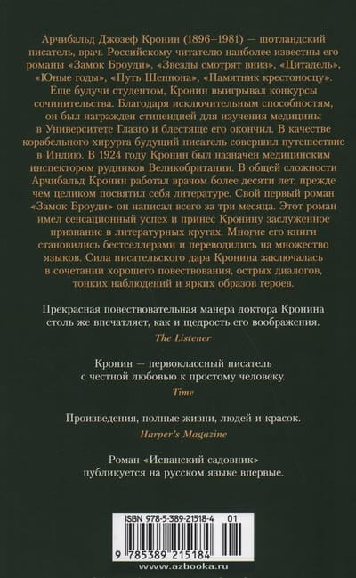 Романы «Испанский садовник» и «Древо Иуды» написаны в прекрасной повествовательной манере классических произведений Кронина.