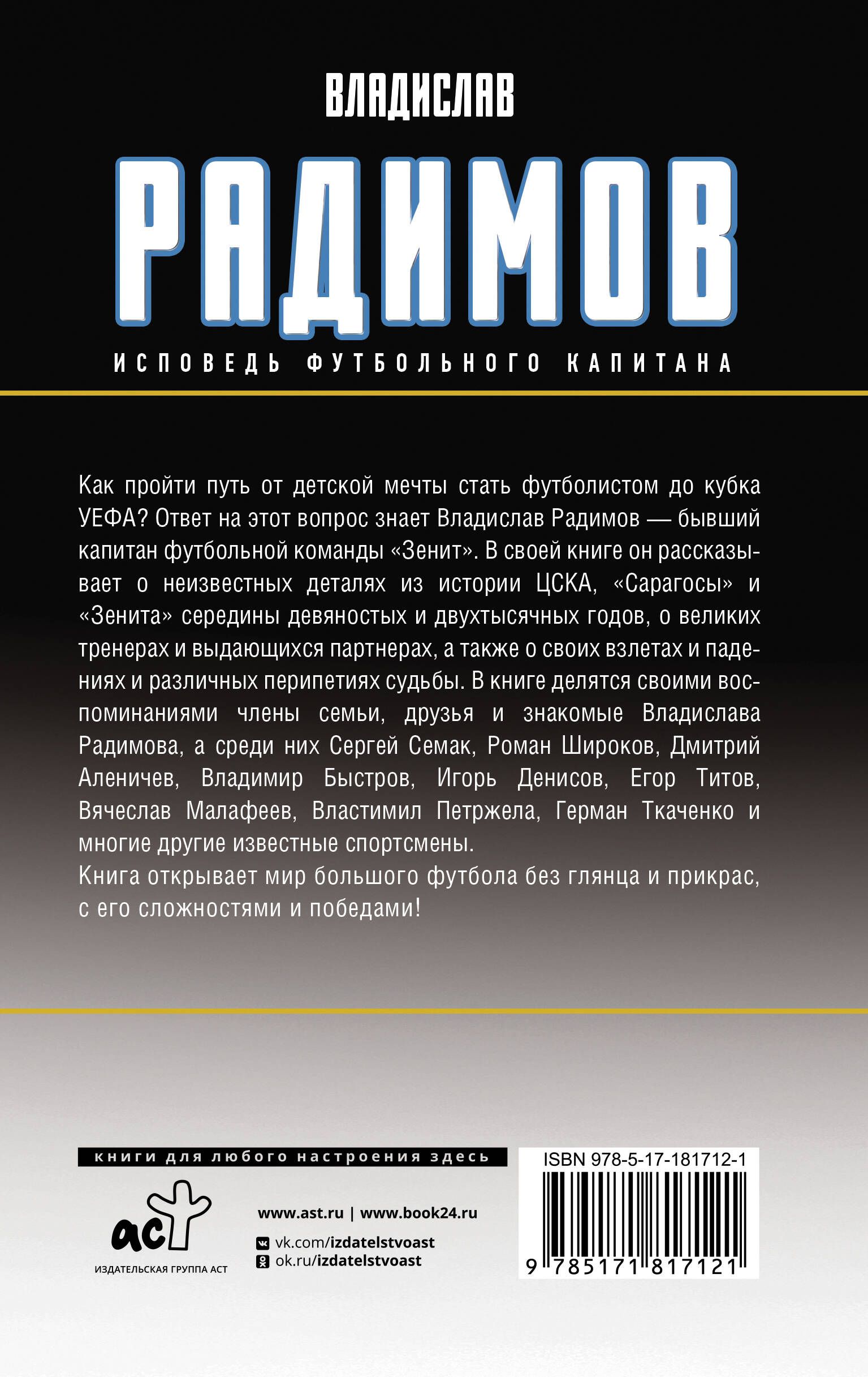 Как пройти путь от детской мечты стать футболистом до Кубка УЕФА? Ответ на этот вопрос знает Владислав Радимов — бывший капитан футбольной команды «Зенит». В своей книге он рассказывает о неизвестных деталях из истории ЦСКА, «Сарагосы» и «Зенита» середины девяностых и двухтысячных годов, о великих тренерах и выдающихся партнёрах, а также о своих взлётах и падениях и различных перипетиях судьбы.
