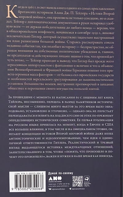 Когда в 1961 г. в свет вышла книга одного из самых прославленных британских историков Алана Дж. П. Тейлора «Истоки Второй мировой войны», она произвела не только сенсацию, но и скандал. Тейлор с дипломатическими документами в руках оспаривал удобную всем версию, что в недавнем общеевропейском конфликте виноват только и исключительно Гитлер, осуществлявший тщательно выстроенный им план разжигания большой войны. Вместо этого Тейлор приходит к выводу, что Гитлер был прежде всего агрессивным оппортунистом с фантазиями о величии и что к объявлению Великобританией и Францией войны Германии в сентябре 1939 г. помимо того привела огромная масса факторов — от объективного баланса потенциалов европейских государств до внутренних противоречий в западных обществах.