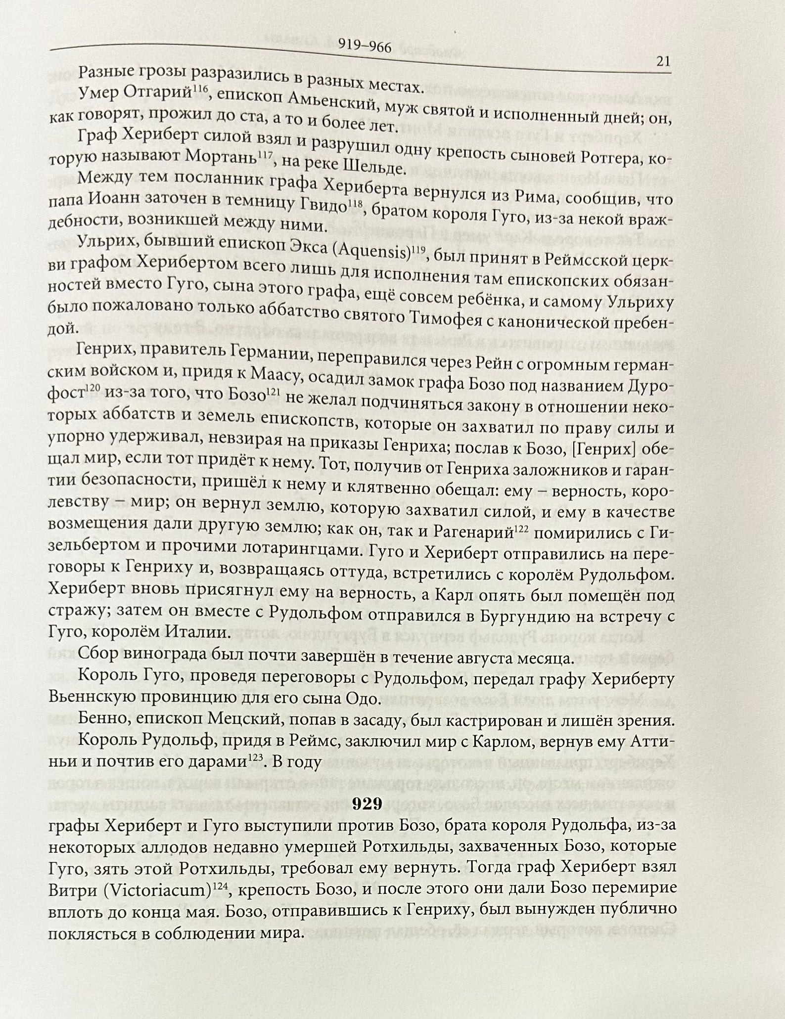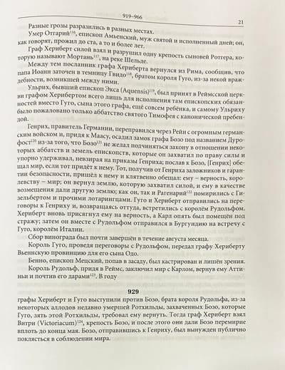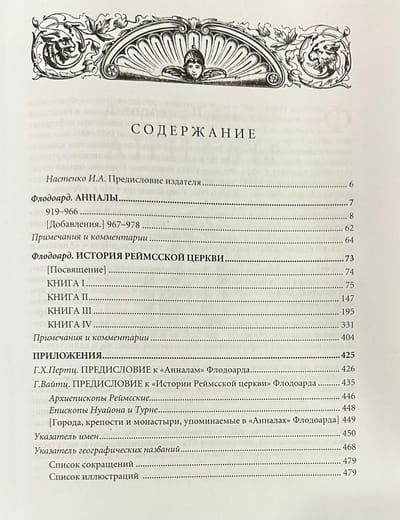Флодоард Реймсский (894-966) — крупнейший из первых хронистов Западно-Франкского королевства, будущей Франции. Главными трудами Флодоарда и важнейшими источниками по истории Франции являются «‎Анналы»‎ и «‎История Реймсской Церкви»‎ в 4-х книгах. «‎Анналы»‎ — одна из немногих хроник X в., написанных современником описываемых событий, и единственная крупная западно-франкская хроника, сохранившаяся с того времени. «‎История Реймсской церкви»‎ излагается от основания г. Реймса во времена Ромула и Рема, включает всю христианскую историю города до 948 г. Эта «‎История»‎ является традиционным образцом жанра gesta episcoporum («‎Деяния епископов»‎). Справочный аппарат издания содержит примечания и комментарии к каждой книге, список епископов, подробный именной и географический указатели. В книгу вошли переводы двух главных сочинений Флодоарда.