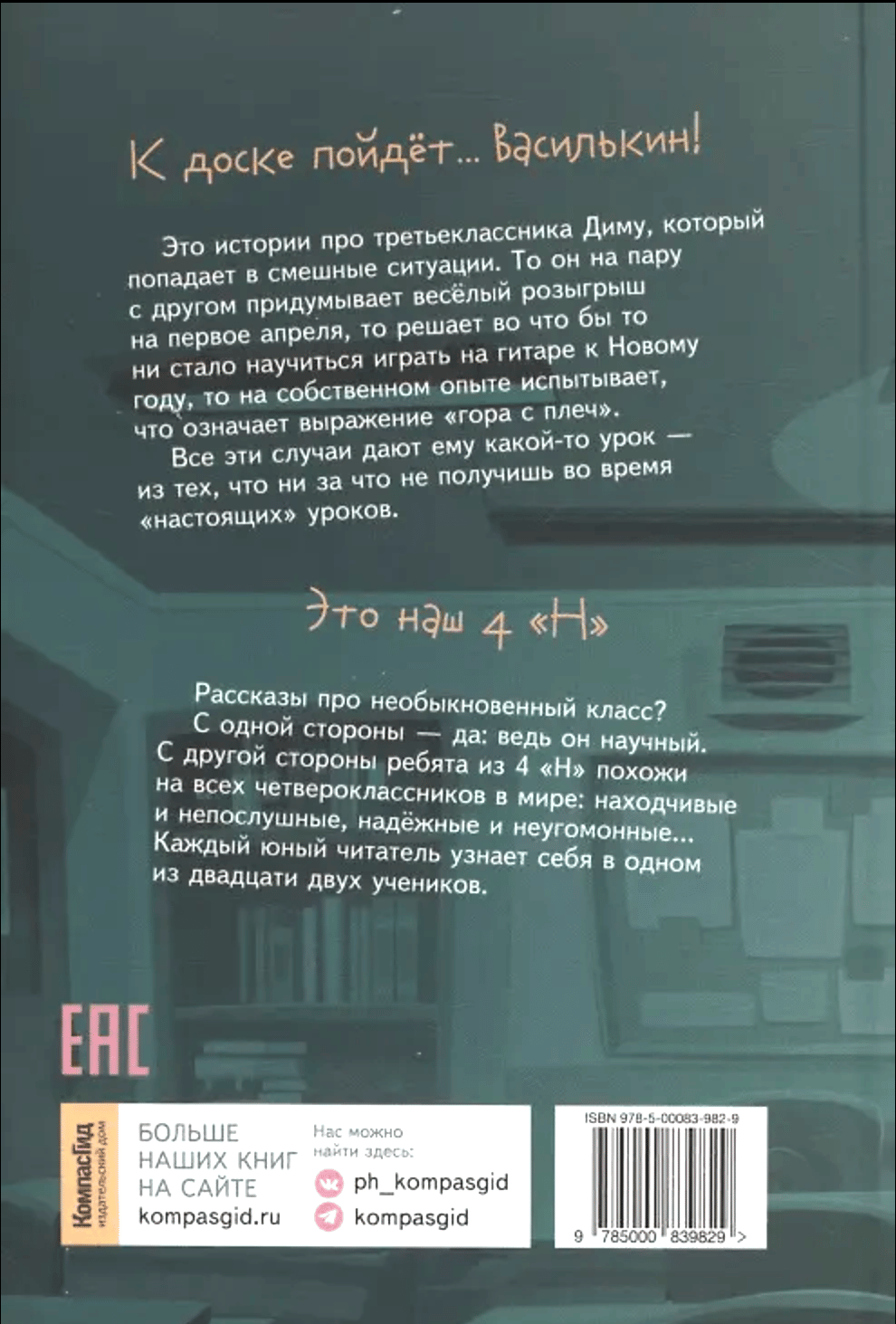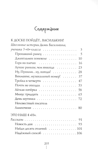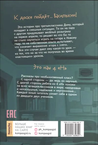 «К доске пойдёт… Василькин!» — это истории про третьеклассника Диму, который попадает в смешные ситуации. То он на пару с другом придумывает весёлый розыгрыш на первое апреля, то решает во что бы то ни стало научиться играть на гитаре к Новому году, то на собственном опыте испытывает, что означает выражение «гора с плеч». Все эти случаи дают ему какой-то урок — из тех, что ни за что не получишь во время «настоящих» уроков.