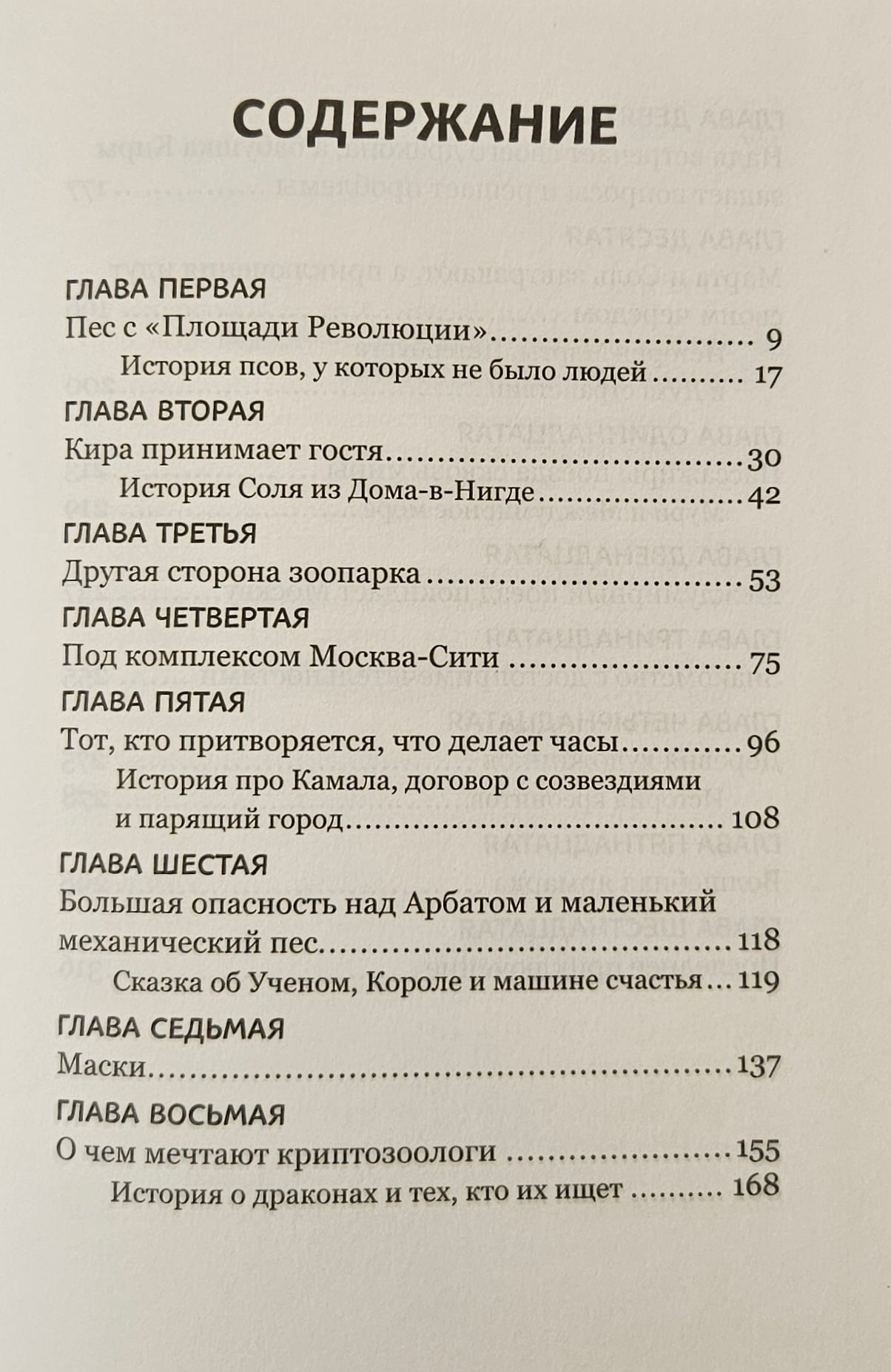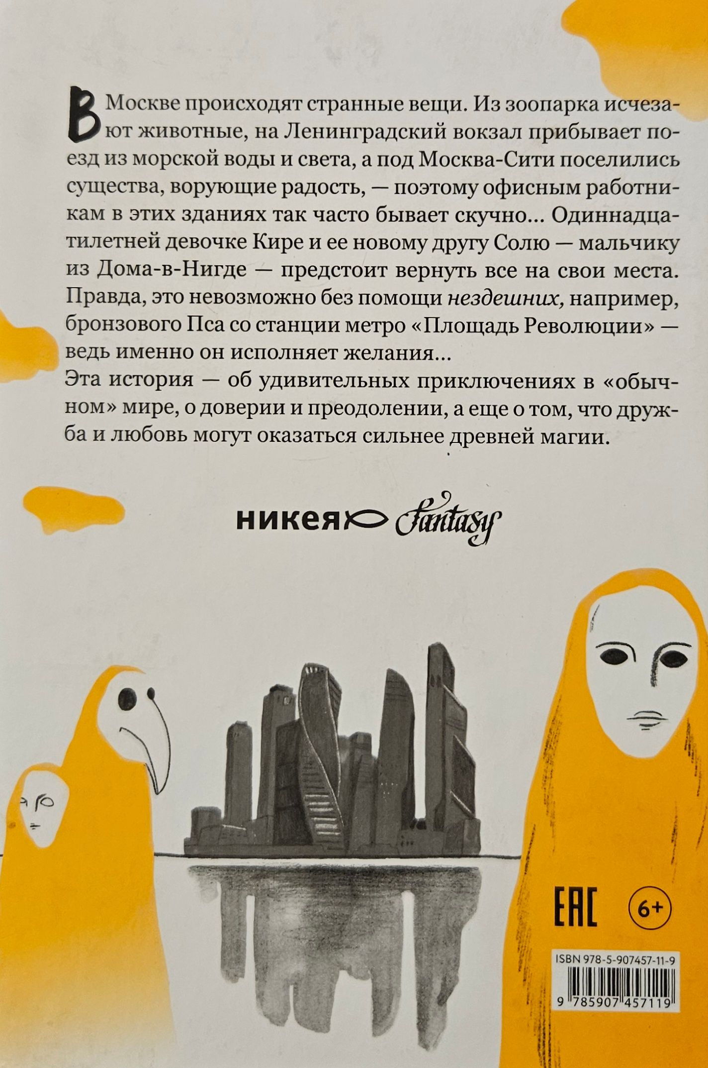 В Москве происходят странные вещи. Из зоопарка исчезают животные, на Ленинградский вокзал прибывает поезд из морской воды и света, а под Москва-Сити поселились существа, ворующие радость, — поэтому офисным работникам в этих зданиях так часто бывает скучно. Одиннадцатилетней девочке Кире и ее новому другу Солю — мальчику из Дома-в-Нигде — предстоит вернуть все на свои места. Правда, это невозможно без помощи нездешних, например, бронзового Пса со станции метро «Площадь Революции» — ведь именно он исполняет желания...