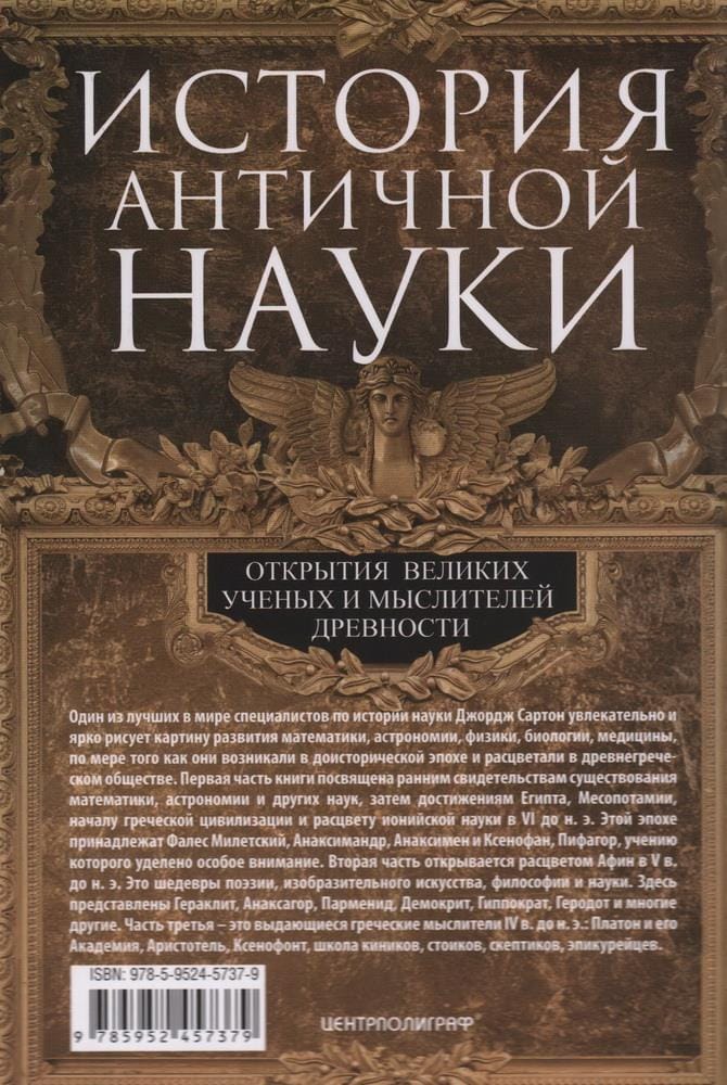Один из лучших в мире специалистов по истории науки Джордж Сартон увлекательно и ярко рисует картину развития математики, астрономии, физики, биологии, медицины, по мере того как они возникали в доисторической эпохе и расцветали в древнегреческом обществе. Первая часть книги посвящена ранним свидетельствам существования математики, астрономии и других наук, затем достижениям Египта, Месопотамии, началу греческой цивилизации и расцвету ионийской науки в VI до н. э. Этой эпохе принадлежат Фалес Милетский, Анаксимандр, Анаксимен и Ксенофан, Пифагор, учению которого уделено особое внимание. Вторая часть открывается расцветом Афин в V в. до н. э. Это шедевры поэзии, изобразительного искусства, философии и науки. Здесь представлены Гераклит, Анаксагор, Парменид, Демокрит, Гиппократ, Геродот и многие другие. Часть третья – это выдающиеся греческие мыслители IV в. до н. э.: Платон и его Академия, Аристотель, Ксенофонт, школа киников, стоиков, скептиков, эпикурейцев.