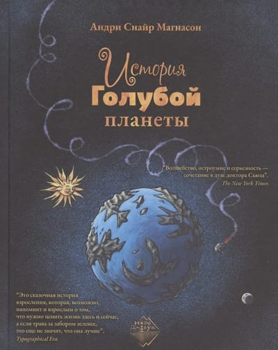 На Голубой планете нет взрослых, она населена детьми, которые делают всё, что им заблагорассудится, и никто не указывает им, как надо жить. Однажды на планету детей приземляется загадочный человек, и начинают происходить чудеса. Прогремевшая на весь мир повесть исландского писателя Андри Снайра Магнасона начинается как невинная сказка и перерастает в философскую притчу о современном мире. Почему нельзя всегда быть счастливым? Хорошо ли, если все желания начнут исполняться? Что такое вой на? Почему одним всё, а другим ничего? Книга получила рекордное количество наград в Исландии и за рубежом, в том числе Британскую национальную книжную премию, Международную премию им. Януша Корчака, Американскую международную премию «Зеленая планета», а недавно была выбрана лучшей детской книгой в Китае. «История Голубой планеты» издана более чем в 35 странах мира, а также поставлена на сцене в нескольких детских театрах разных стран.