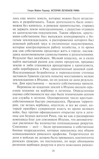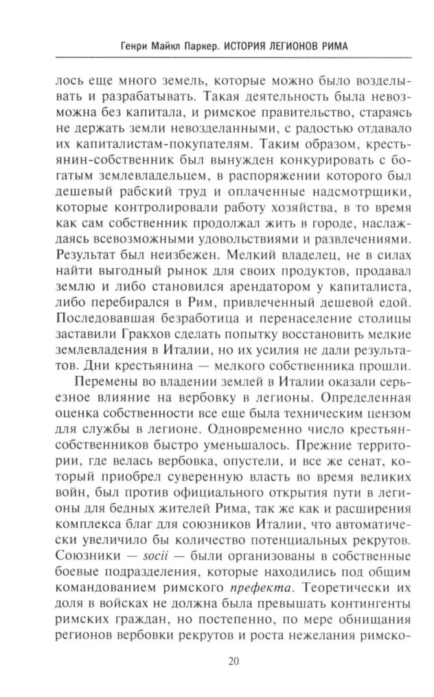 Авторитетный английский историк Г.М.Д. Паркер, преподаватель колледжа Магдалины в Оксфорде, в своей книге рассматривает все аспекты внутренней организации римской армии со времен военной реформы Гая Мария до начала III века н. э. Ученый описывает символику и атрибутику частей, вооружение и экипировку офицеров и солдат, особенности несения службы в мирное время и в период военных кампаний. Особый интерес представляют главы, посвященные повседневной жизни легионера, деталям его службы — оплате, питанию, наградам и наказаниям. Ученый также рассказывает о системе денежных накоплений, семейном положении легионеров и особенностях жизни в каструме — военном лагере.