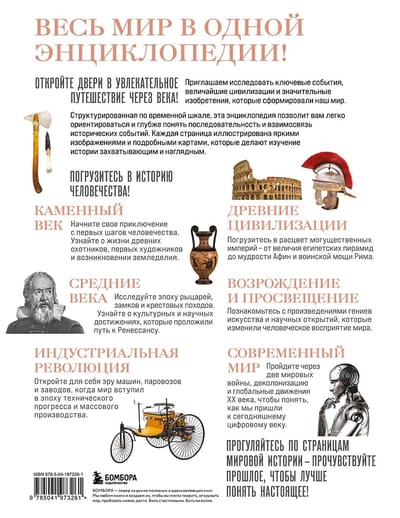 От первых шагов человечества в Каменном веке и величественных империй Древнего мира до замков и рыцарей Средневековья, от гениальных открытий эпохи Возрождения и технических чудес Индустриальной революции до глобальных событий современности — эта энциклопедия станет вашим путеводителем по прошлому, помогая глубже понять настоящее.