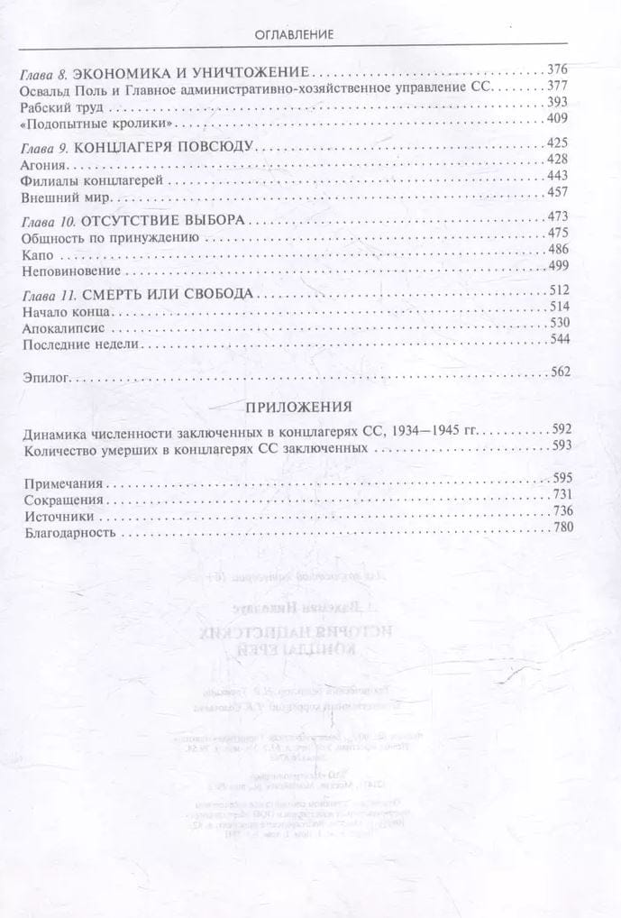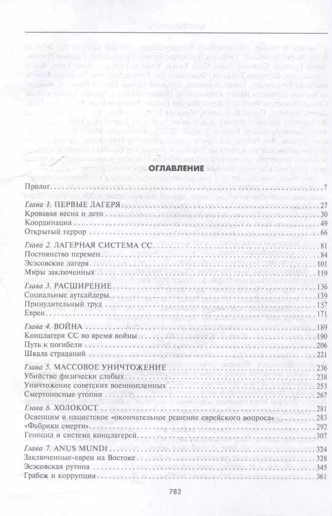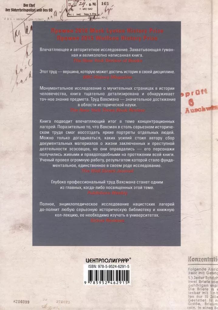 Известный историк, профессор Бирбек­колледжа Лондонского университета Николаус Вахсман исследовал и представил полную историю нацистских концентрационных лагерей с 1933 по 1945 год. Основываясь на подлинных документальных материалах о лагерях Освенцим, Дахау, Заксенхаузен, Бухенвальд, Маутхаузен, Флоссенбюрг, Равенсбрюк и многих других (двадцать два крупных лагеря и более тысячи лагерей­спутников опутали Германию и Европу), автор представил историю создания, цели, принципы, структуру и систему управления этой чудовищной человеконенавистнической машиной по уничтожению людей, обратив особое внимание на невероятные по жестокости условия содержания в них узников. Заключая свой колоссальный труд, автор высказывает мысль о том, что «система концлагерей была великим извратителем ценностей, является историей бесчеловечных мутаций совести, сделавших нормой насилие, пытки и убийства». И настаивает: современный мир не имеет права об этом забывать. В приложении приведены данные о заключенных лагерей, начиная с 1935 по 1945 год.